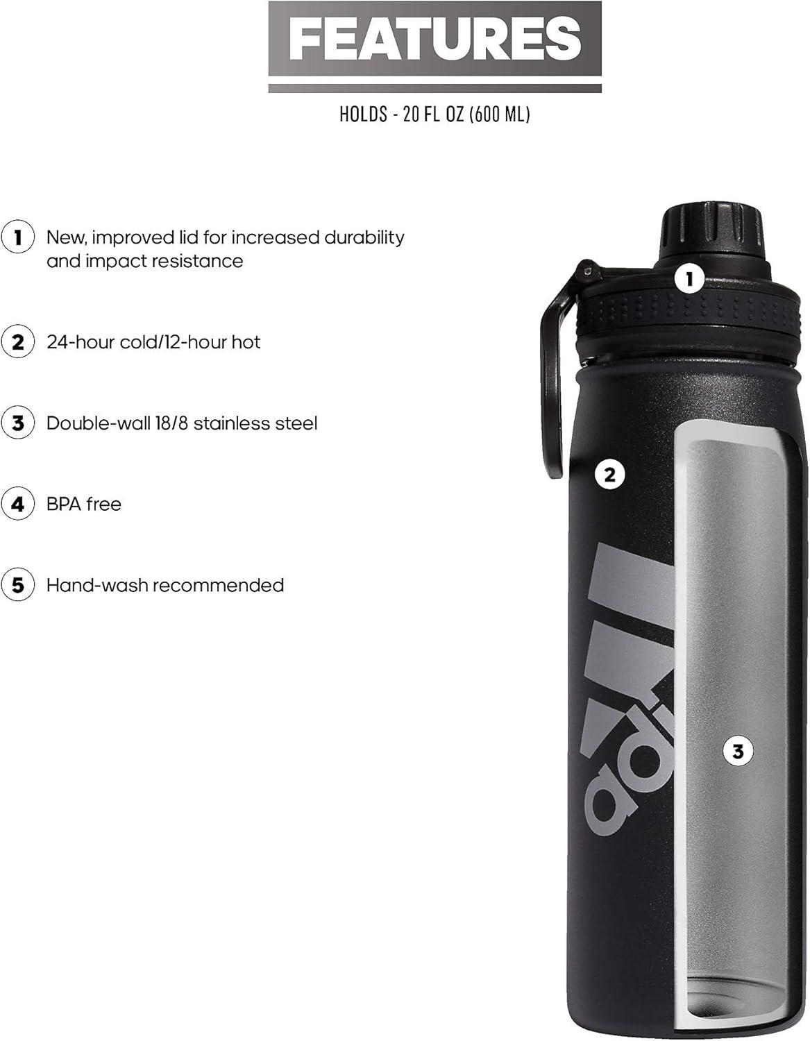 adidas 20 oz Stainless Steel Water Bottle, Insulated Double-Walled 18/8 Metal, Men, Women, Girls and Boys(Black/Silver Metallic)