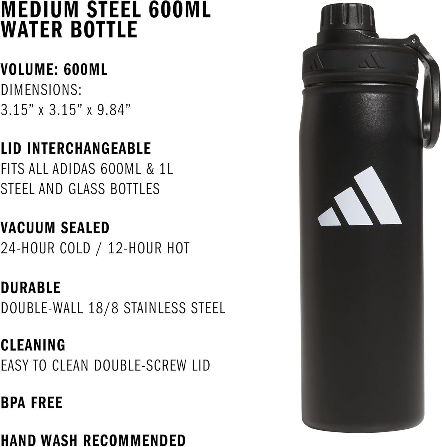 Sip water at the gym or coffee on the train with this adidas stainless water bottle. This black water bottle features a double-wall design that keeps hot liquids hot and cold liquids cold for hours. Its 600-milliliter capacity makes it a practical choice for those looking for a travel water bottle. Additionally, this BPA free water bottle works well as an insulated coffee mug, suitable for travel coffee mugs users who need thermal cups for hot and cold drinks.