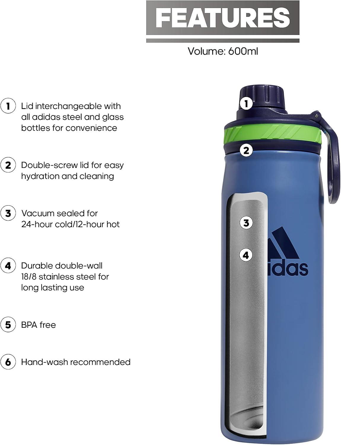Sip water at the gym or coffee on the train with this adidas stainless water bottle. This black water bottle features a double-wall design that keeps hot liquids hot and cold liquids cold for hours. Its 600-milliliter capacity makes it a practical choice for those looking for a travel water bottle. Additionally, this BPA free water bottle works well as an insulated coffee mug, suitable for travel coffee mugs users who need thermal cups for hot and cold drinks.