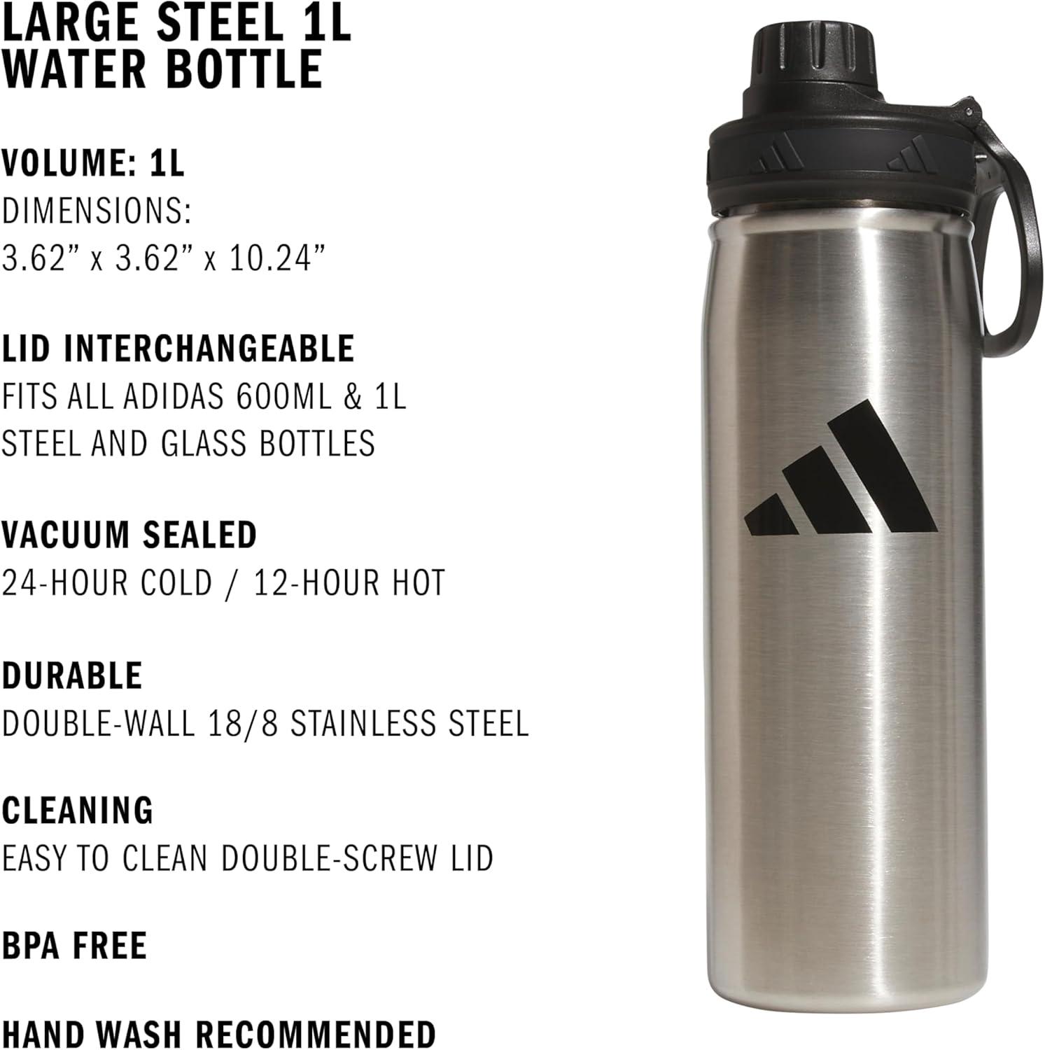adidas 20 oz Stainless Steel Water Bottle, Insulated Double-Walled 18/8 Metal, Men, Women, Girls and Boys(Stainless Steel/Black)