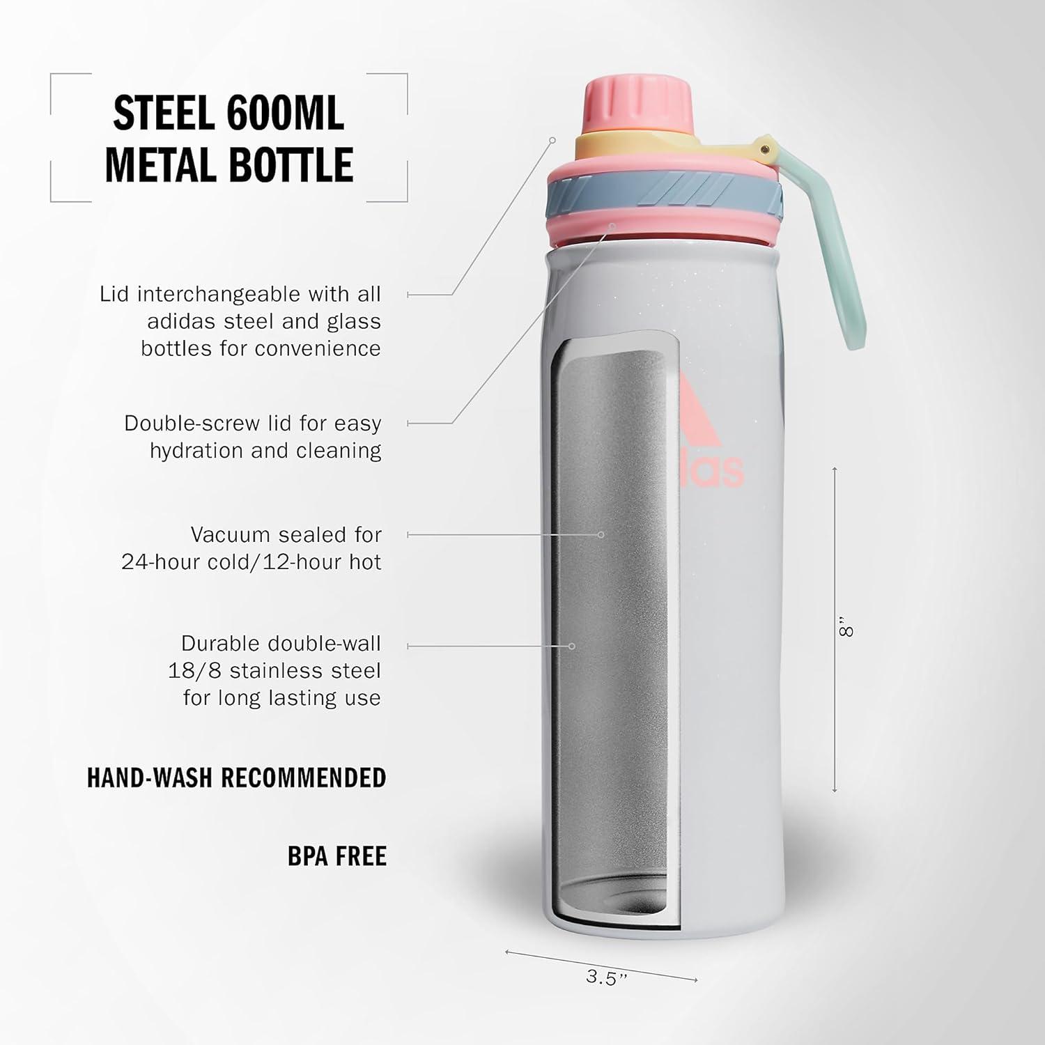 Sip water at the gym or coffee on the train with this adidas stainless water bottle. This black water bottle features a double-wall design that keeps hot liquids hot and cold liquids cold for hours. Its 600-milliliter capacity makes it a practical choice for those looking for a travel water bottle. Additionally, this BPA free water bottle works well as an insulated coffee mug, suitable for travel coffee mugs users who need thermal cups for hot and cold drinks.