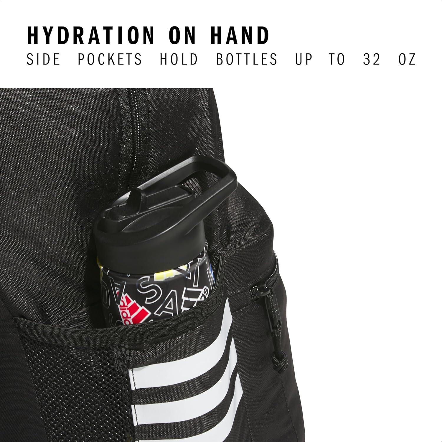 Two side water bottle pockets that fit up to 32 oz bottles