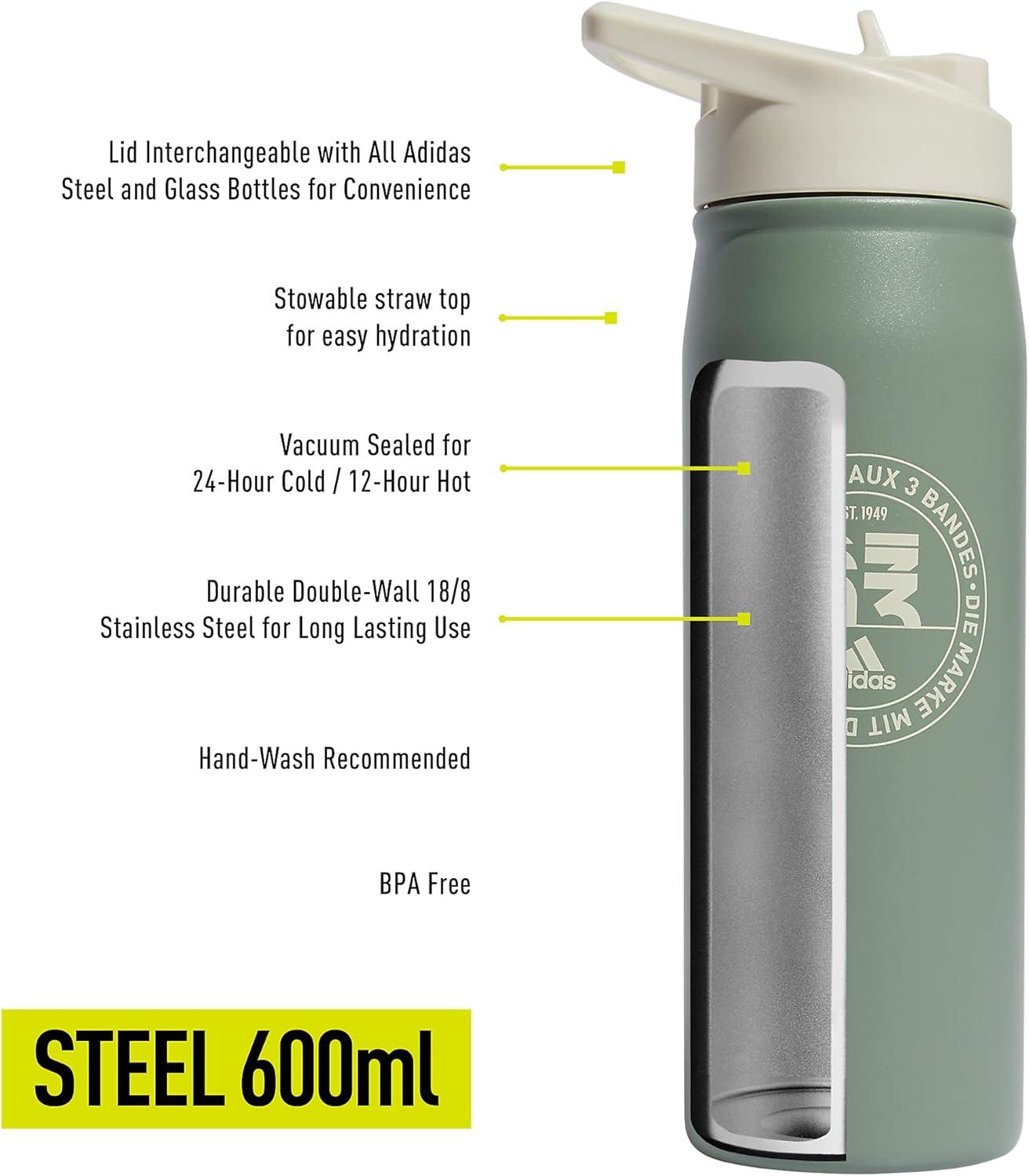 adidas 600 ML (20 oz) Straw Top Metal Water Bottle, Hot/Cold Double-Walled Insulated 18/8 Stainless Steel(Silver Green/Alumina Beige)