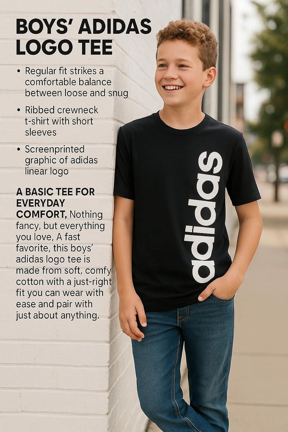 This adidas boys’ short sleeve t-shirt delivers clean, athletic style with all-day comfort. Made from soft, breathable cotton jersey, it offers a regular fit that feels relaxed without being too loose. The ribbed crewneck holds its shape through repeated wear, and the bold vertical adidas linear logo adds a signature sportswear look. Easy to pair with anything from joggers to denim, this tee is an essential go-to for school days, practice, or weekend downtime.