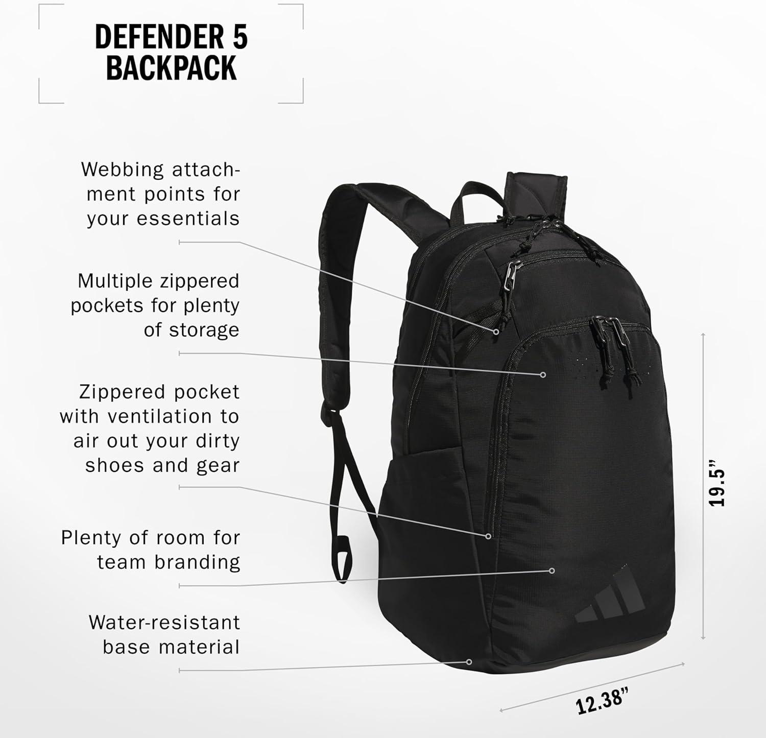 The Defender 5 Backpack keeps your hands free, so you can stay focused when you're heading to practice, a game or school. It's built to last from durable polyester with a water-resistant base and webbing attachment points to clip keys, a water bottle or other essentials. There's a large main area and multiple zippered pockets, including a vented pocket for dirty clothes.