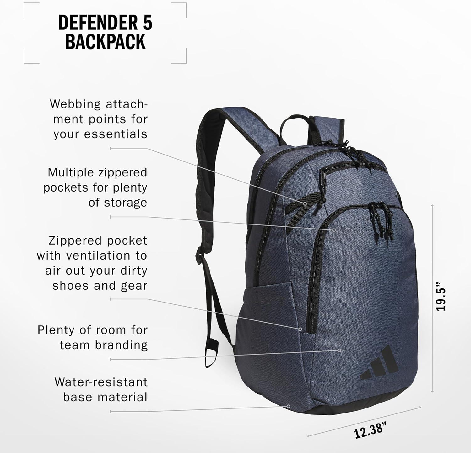 The Defender 5 Backpack keeps your hands free, so you can stay focused when you're heading to practice, a game or school. It's built to last from durable polyester with a water-resistant base and webbing attachment points to clip keys, a water bottle or other essentials. There's a large main area and multiple zippered pockets, including a vented pocket for dirty clothes.