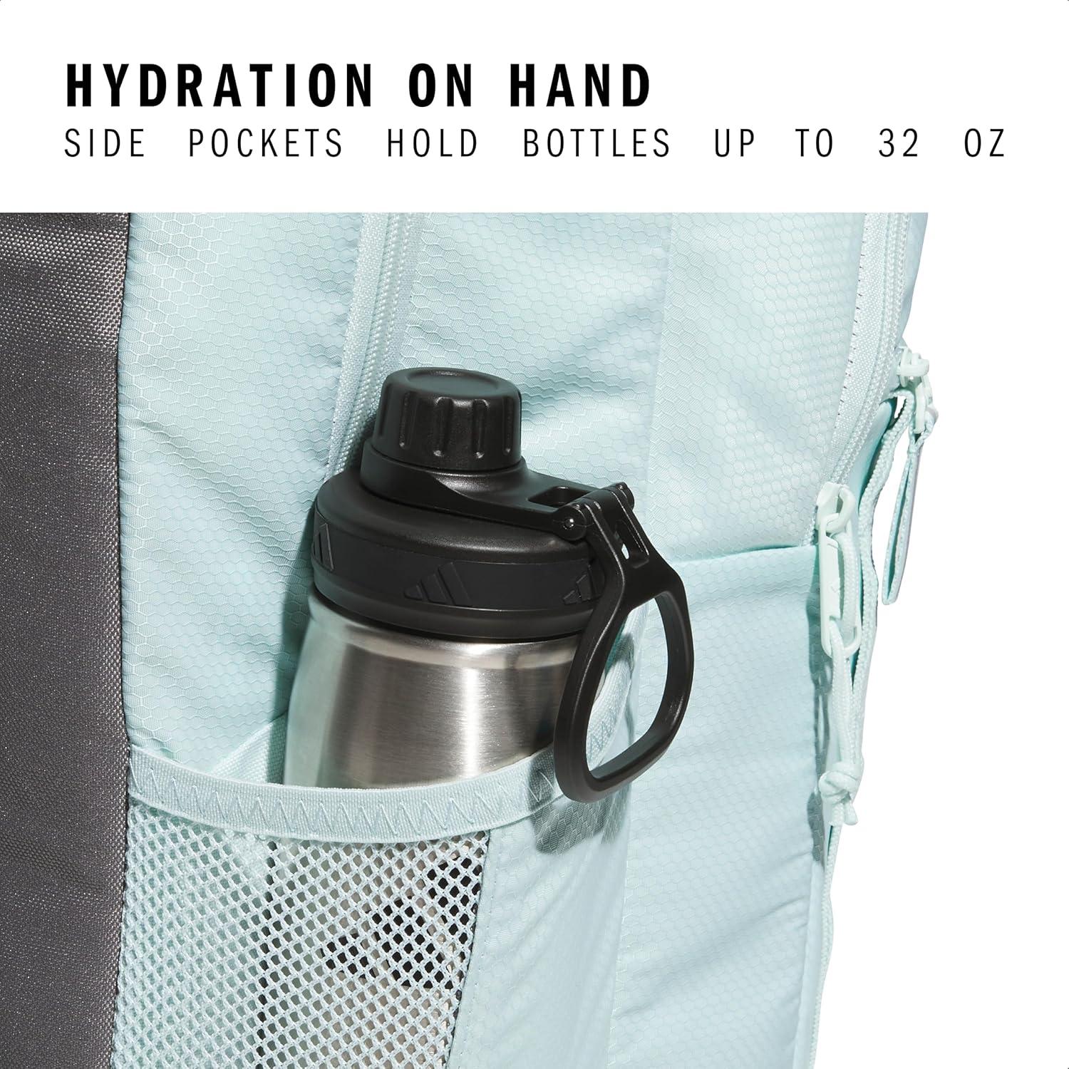 Backpack fits a 16-inch laptop in the interior sleeve and two 32-oz water bottles in side mesh pockets.
