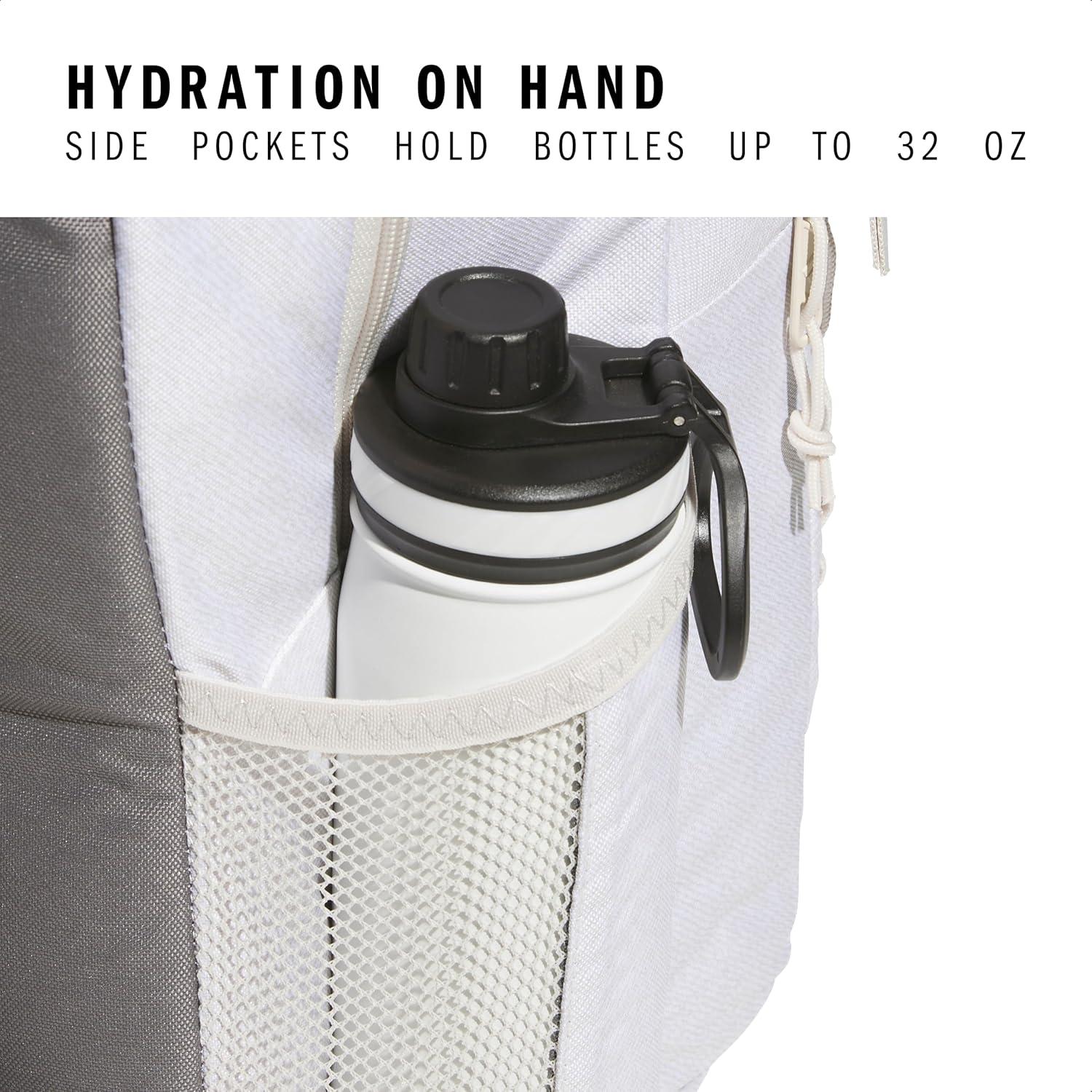 Backpack fits a 16-inch laptop in the interior sleeve and two 32-oz water bottles in side mesh pockets.