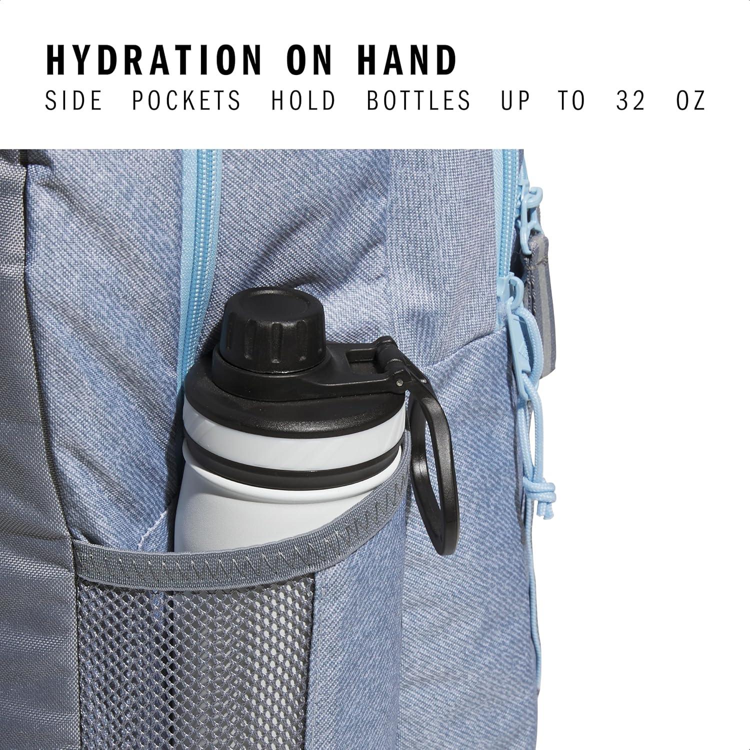 Backpack fits a 16-inch laptop in the interior sleeve and two 32-oz water bottles in side mesh pockets.