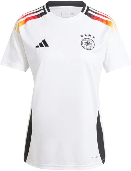 Experience the essence of German soccer with the adidas Germany home jersey. Featuring iconic symbols of the four-time world champions, including an eagle feather-inspired design on the shoulders and embossed details reminiscent of the DFB logo. Engineered for comfortable support, this shirt is equipped with moisture-managing AEROREADY technology and adorned with a woven badge.