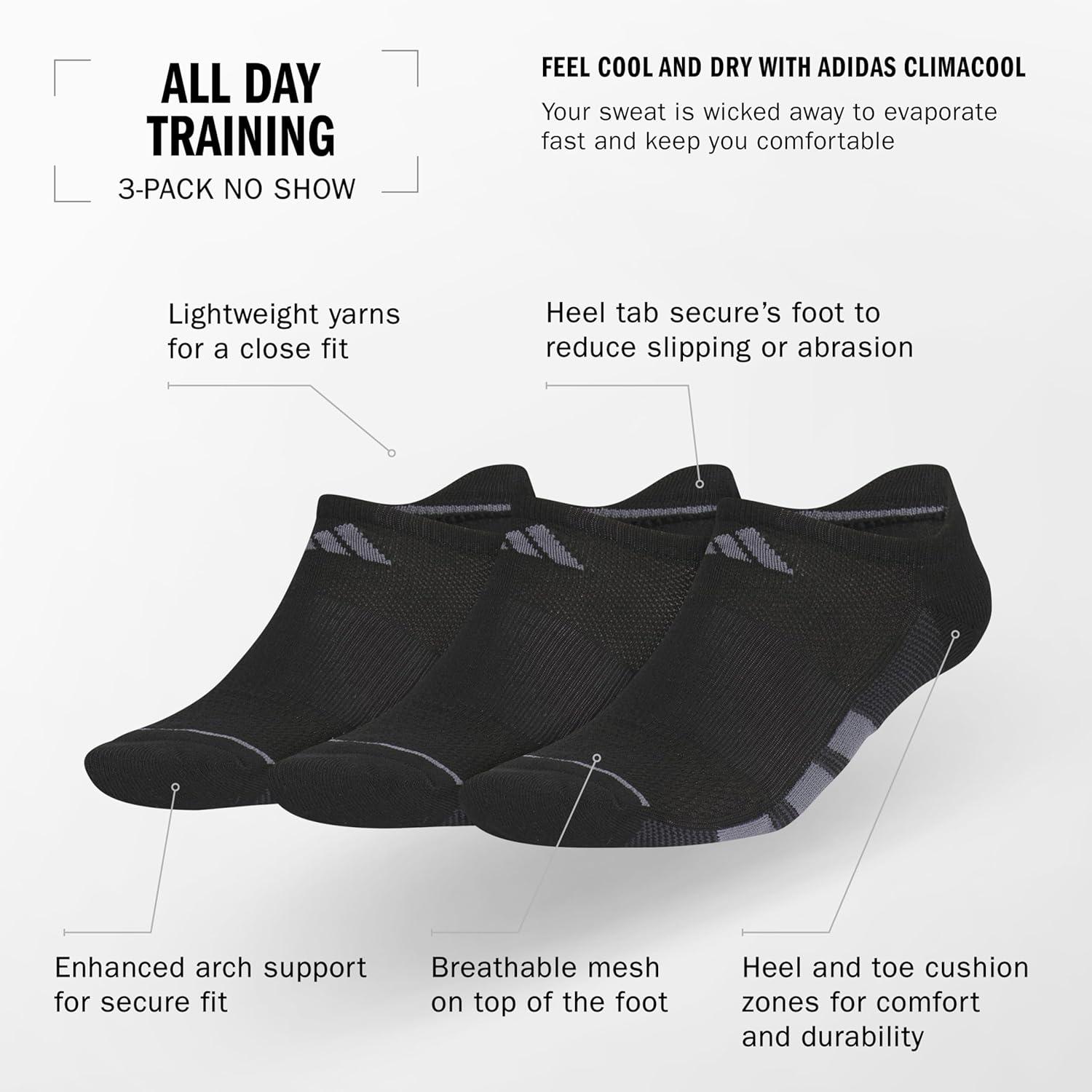 adidas mens All Day Training No Show Socks Engineered for Sport Performance With Targeted Cushioning for Running (3-pair)(White/Black/Clear Onix Grey)