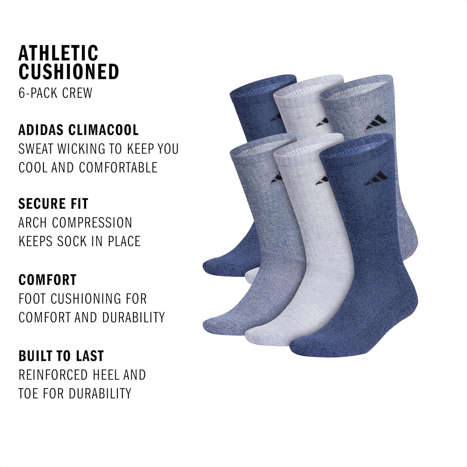 adidas Men’s Athletic Cushioned 6-Pack Crew, Cushioned Crew Socks with Arch Compression for a Secure Fit(Tech Indigo Blue/Grey/Collegiate Navy)