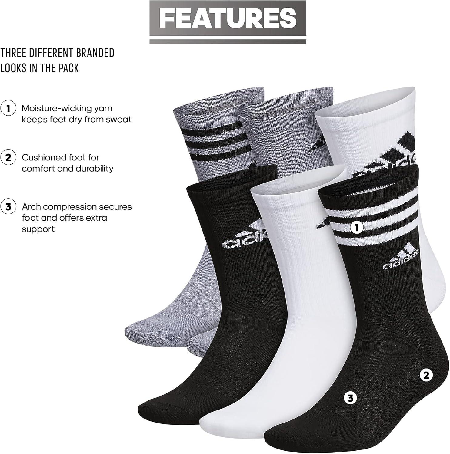 adidas Men’s Athletic Cushioned 6-Pack Crew, Cushioned Crew Socks with Arch Compression for a Secure Fit(White/Black/Heather Grey/Graphic)
