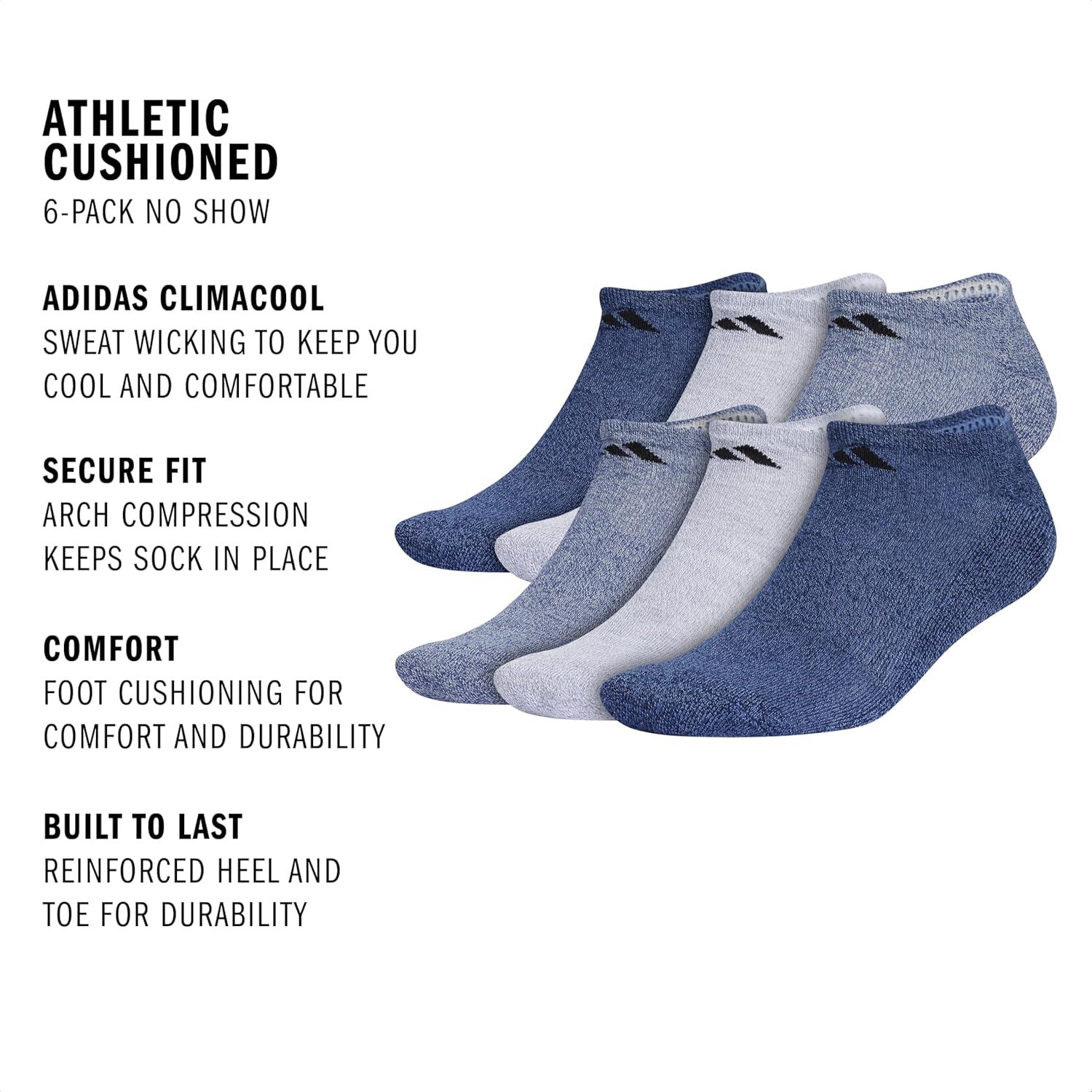 adidas Men’s Athletic Cushioned 6-Pack No Show, Socks for Men(Tech Indigo Blue/Grey/Collegiate Navy)