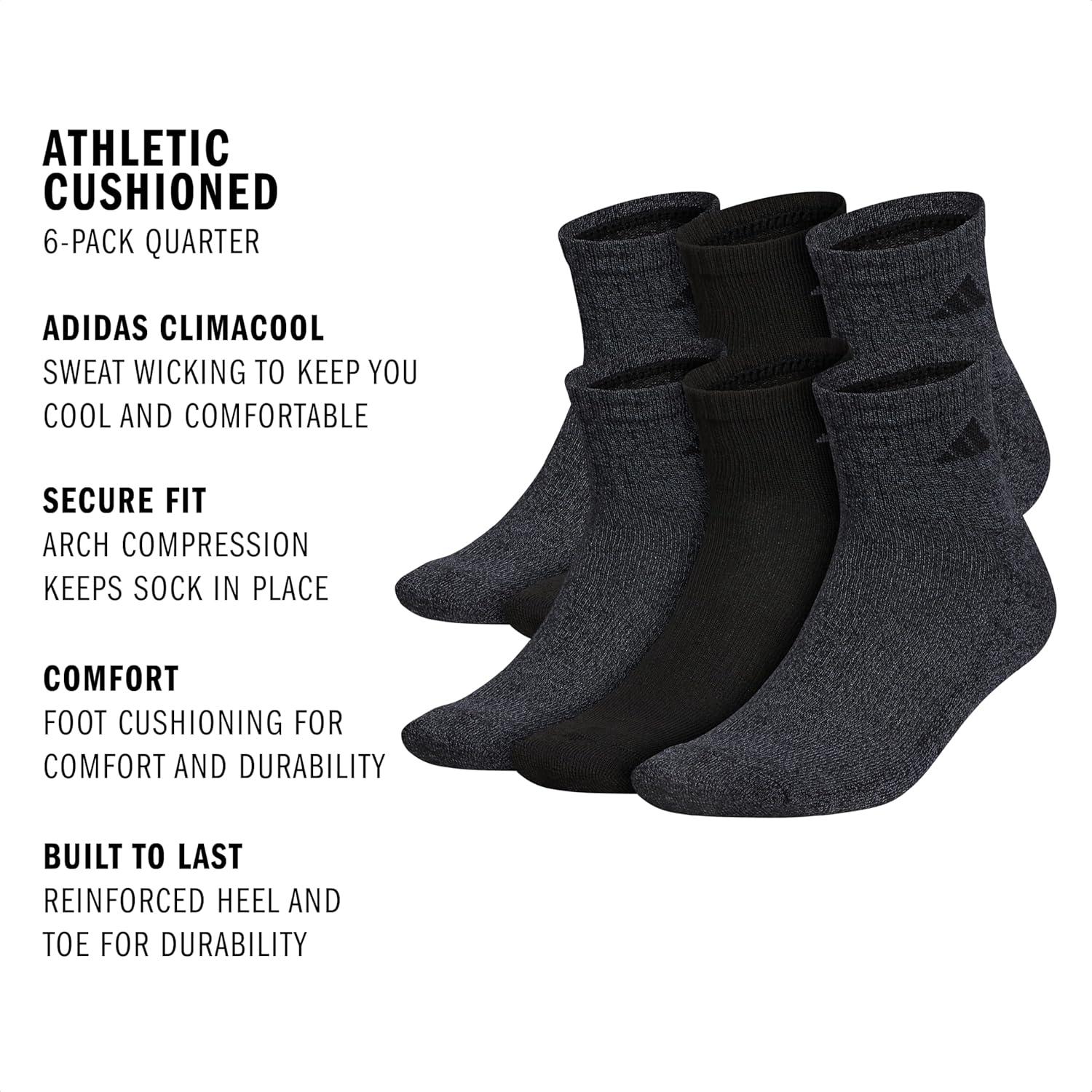 adidas Men’s Athletic Cushioned 6-Pack Quarter, Athletic Cushioned Quarter Ankle Socks for Men with Arch Support(Black/Onix Grey)