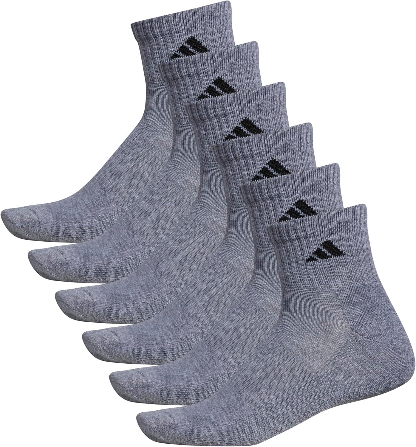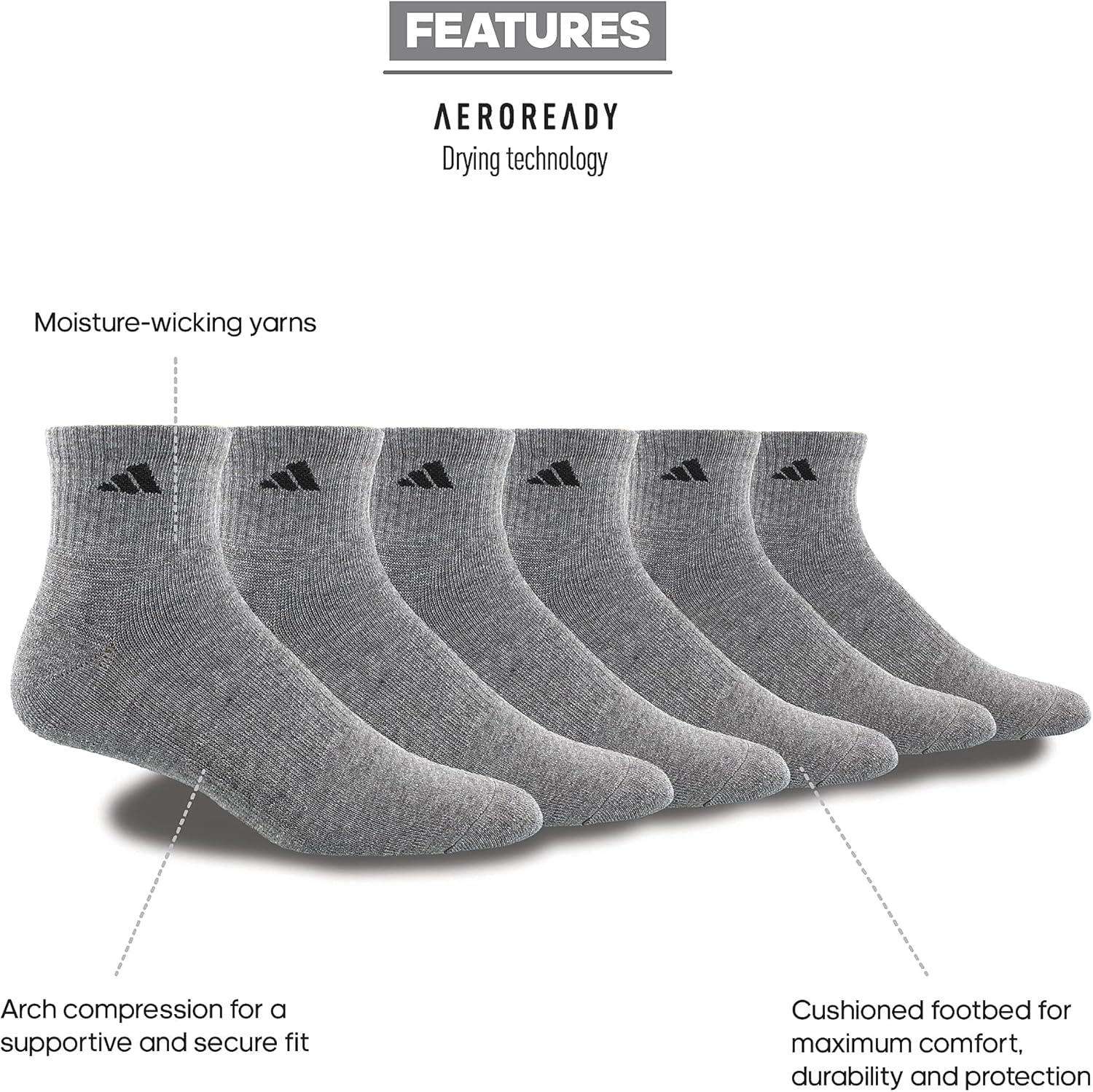 adidas Men’s Athletic Cushioned 6-Pack Quarter, Athletic Cushioned Quarter Ankle Socks for Men with Arch Support(Heather Grey/Black)