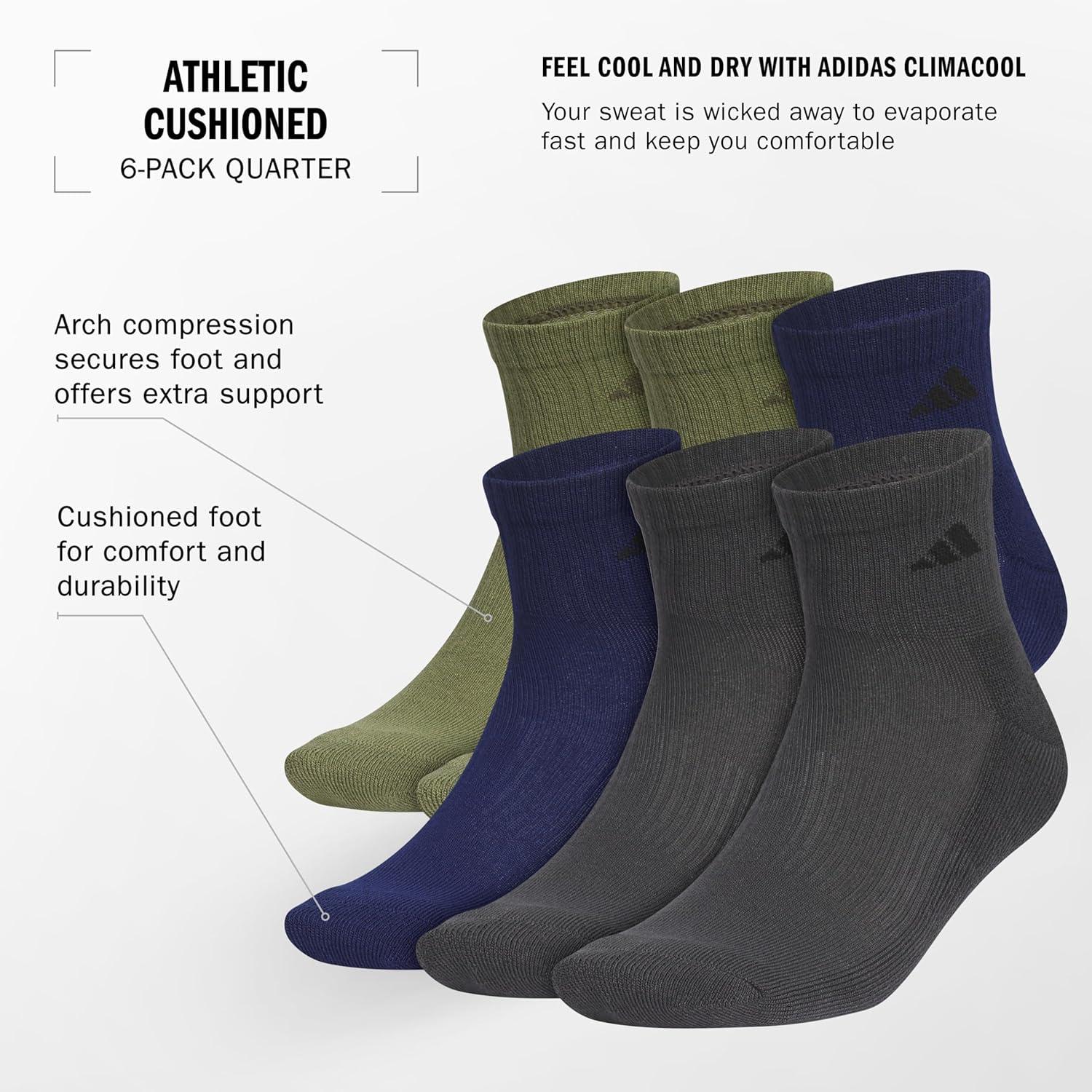 adidas Men’s Athletic Cushioned 6-Pack Quarter, Athletic Cushioned Quarter Ankle Socks for Men with Arch Support(Olive Strata Green/Dark Blue/Carbon Grey)