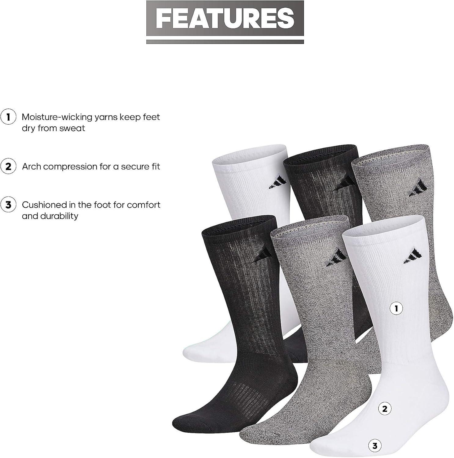 Discover a blend of comfort and performance with adidas Men's Athletic Cushioned Crew Socks. These mens socks come with arch compression for a secure fit, making them ideal as arch support socks. Whether you're searching for running socks men or long socks for men, this six-pair pack offers versatility and durability. Crafted from moisture-wicking yarns, these athletic socks for men keep feet dry, giving a comfortable experience all day. The cushioned foot provides extra comfort, while the secure fit supports daily activities, making them suitable as men socks. Experience comfort with a thoughtful design and durability to support your active lifestyle. Whether for everyday wear or intense athletic routines, adidas delivers quality mens socks to meet every demand.