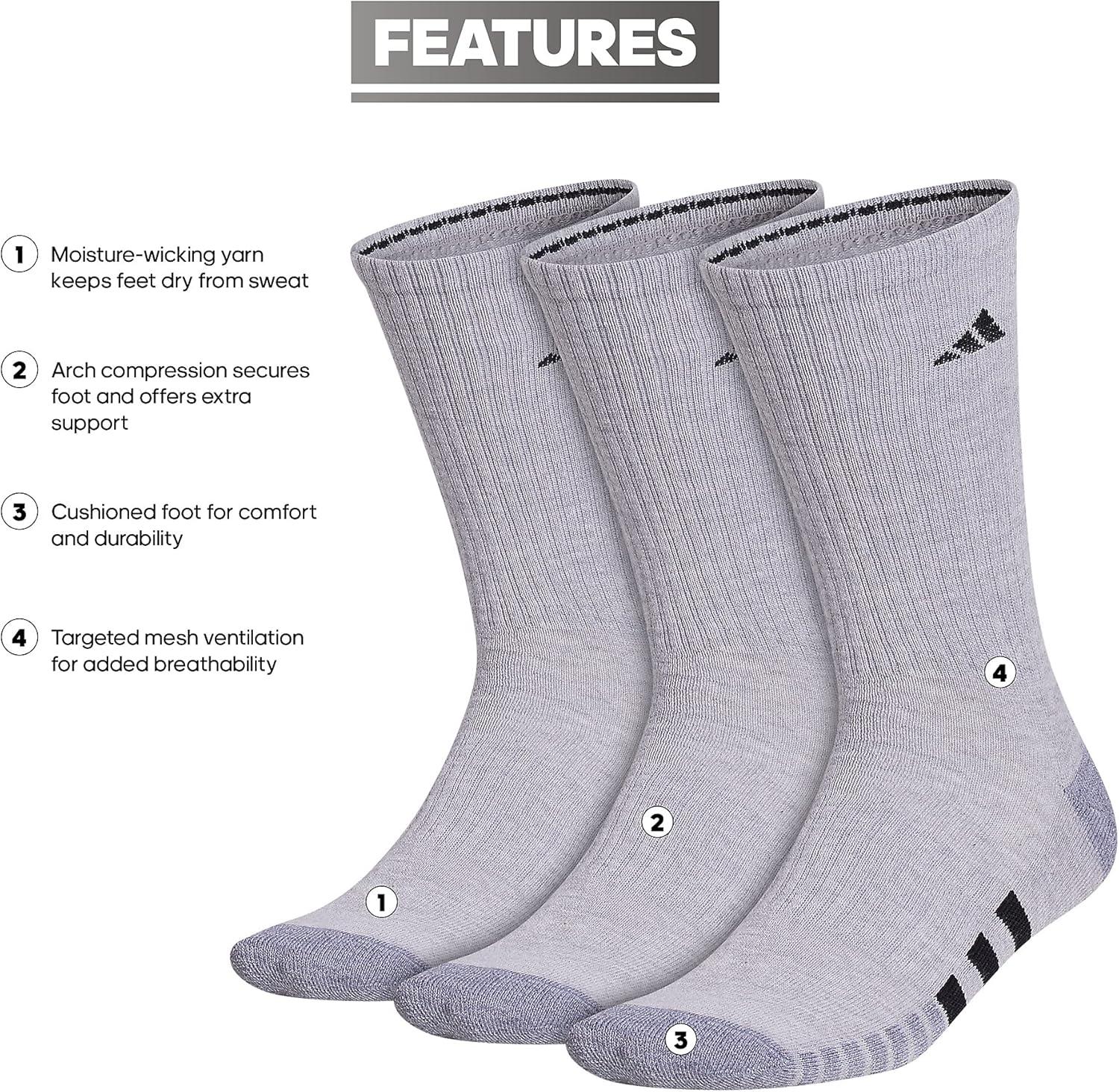 adidas Men’s Crew Socks 3-Pack – Cushioned for Workout(Cool Light Heather/Grey/Black)