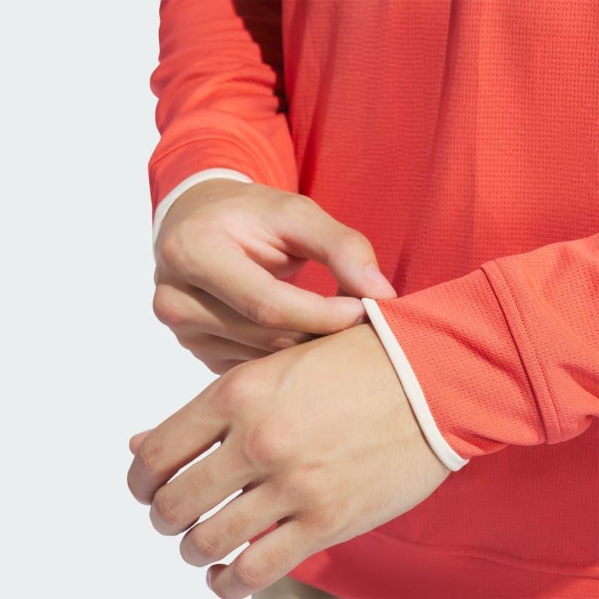 Layer up for comfort on the course. This men's adidas golf top is soft, lightweight and keeps you covered in cool weather. It has a half-zip design so you can customize the airflow and a stand-up collar with a pop of color on the inside. Made with 100% recycled materials, this product represents just one of our solutions to help end plastic waste.