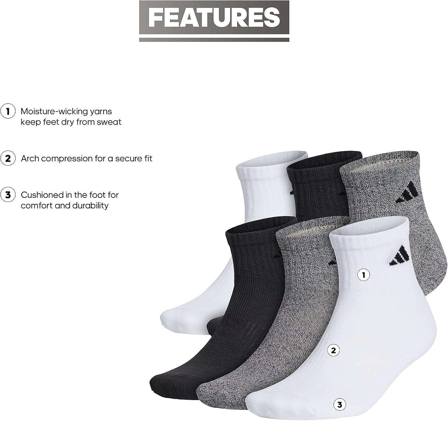 Experience a blend of quality, comfort, and durability with the adidas Men's Athletic Cushioned Quarter Socks, a suitable choice for those who demand the best in their daily wear. This versatile pack of socks for men offers a snug and secure fit, thanks to the innovative arch compression technology. Each pair is crafted to provide superior cushioning, making them great mens running socks for any active lifestyle. Made from moisture-wicking yarns, these socks for men keep your feet dry and comfortable, making them a practical choice as stocking stuffers for adults seeking performance and softness. Available in classic designs of white and black, these men's socks effortlessly blend with any outfit. With a focus on durability and comfort, this pack of socks ensures you'll have the reliable support you need, whether you're hitting the gym or just going about your day.