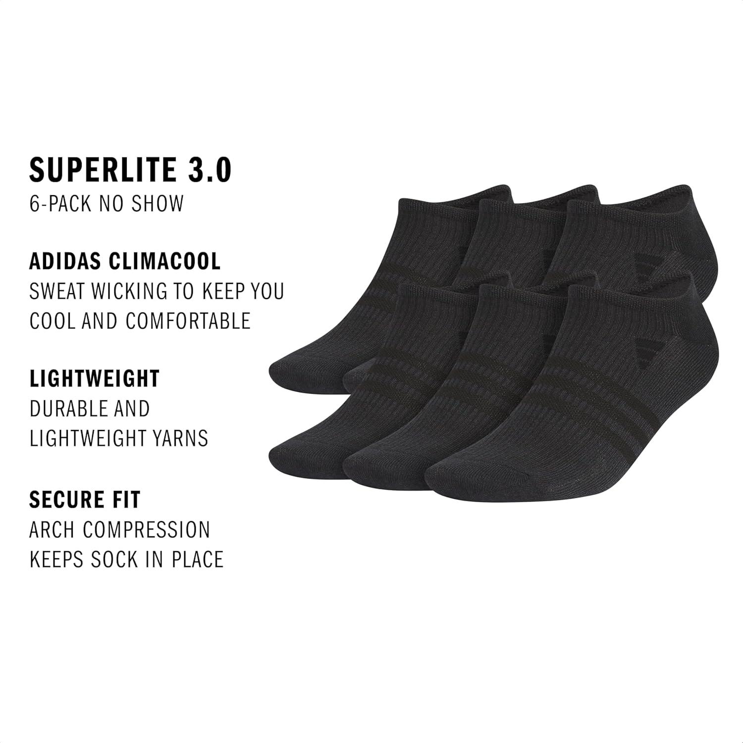 adidas Men’s Superlite No Show Socks with Arch Compression, Athletic, Durable, Lightweight, Breathable, 6-Pack(Black/Night Grey/3.0)