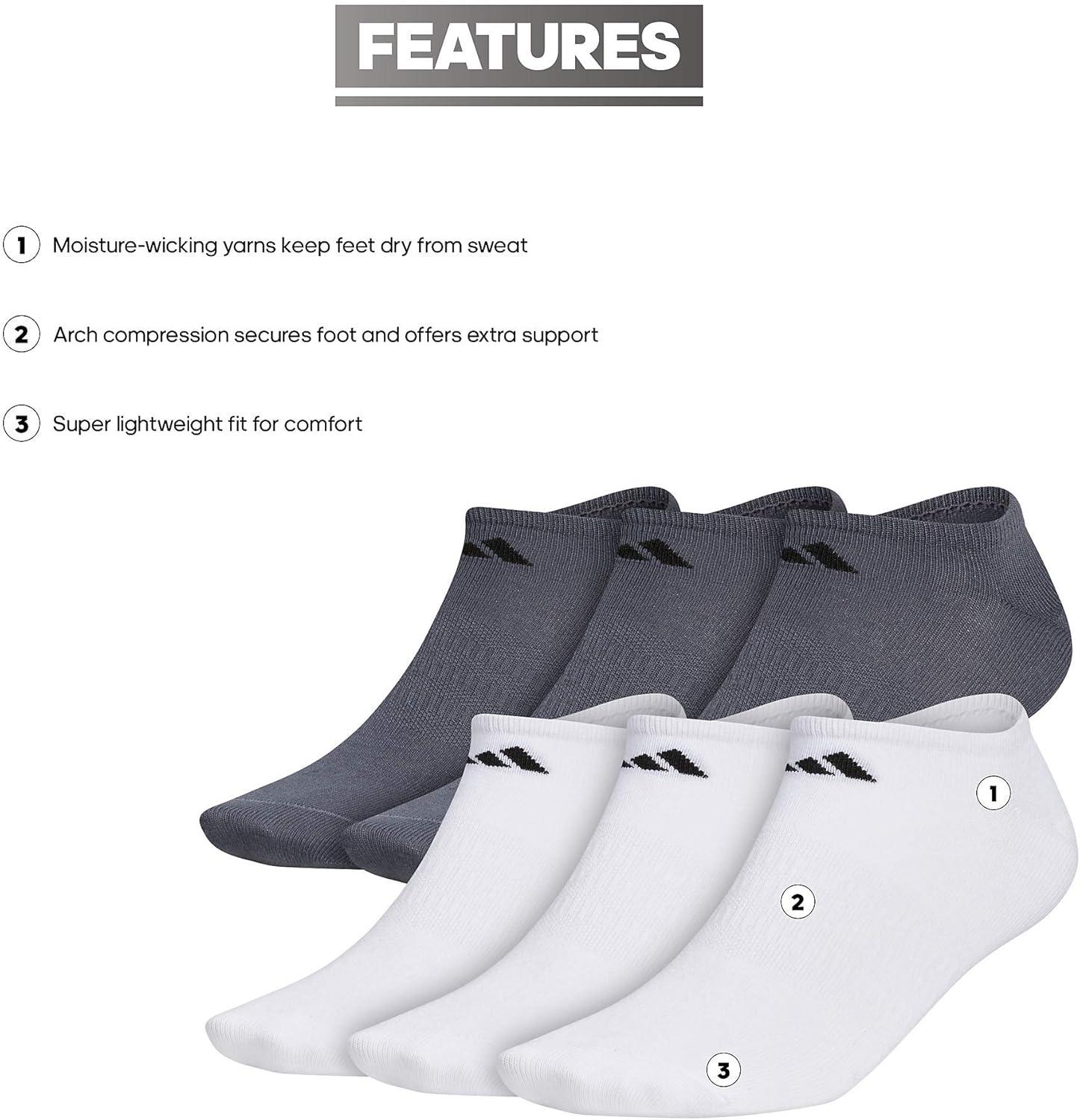 adidas Men’s Superlite No Show Socks with Arch Compression, Athletic, Durable, Lightweight, Breathable, 6-Pack(White/Black/Onix Grey)