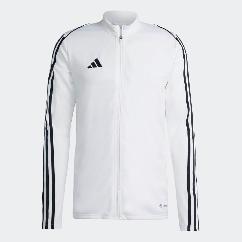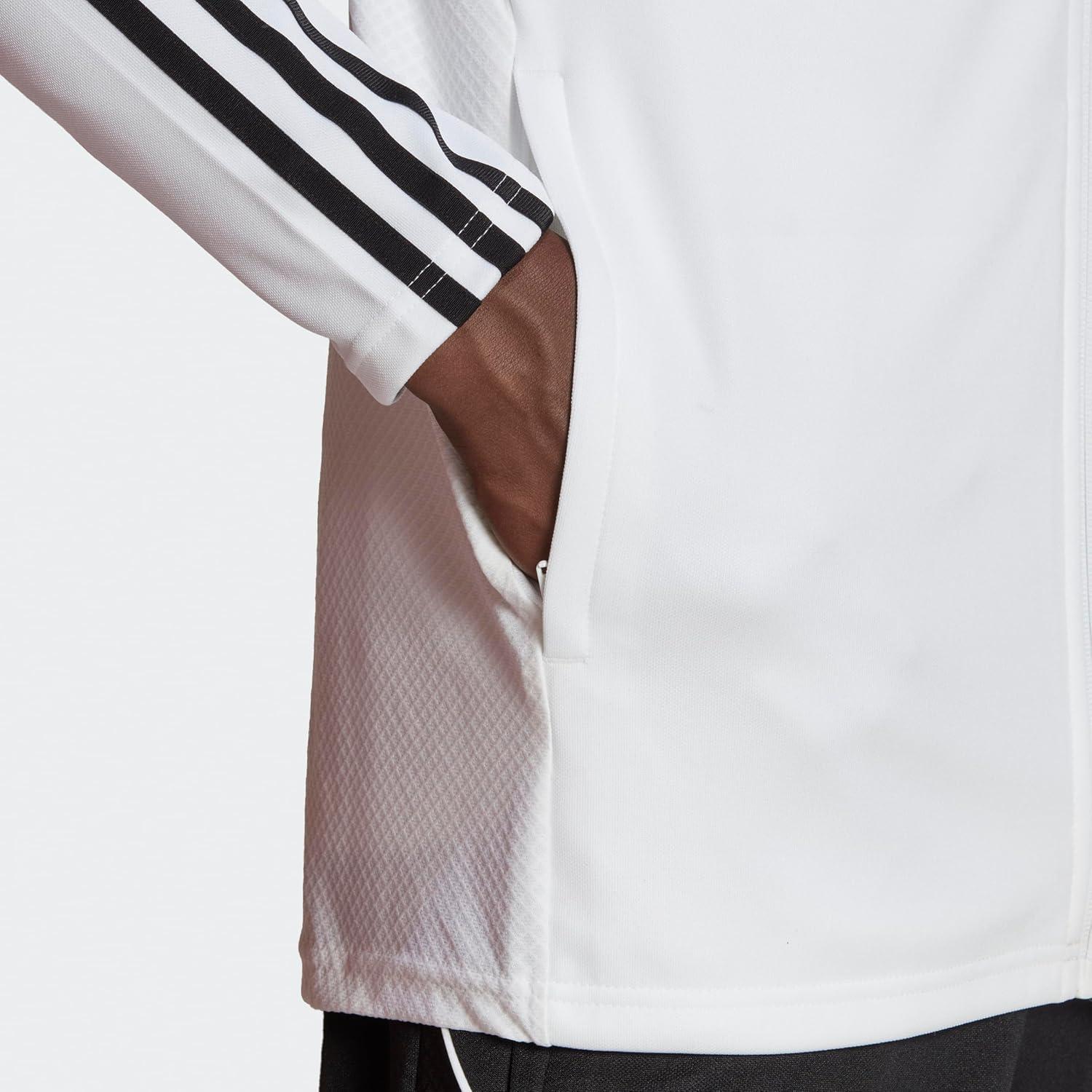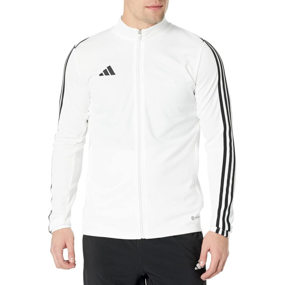 Soccer style for the stadium or the street. This men's adidas track jacket fits slim, so it won't get in your way. AEROREADY manages moisture when you heat up. Front pockets hold your wallet and phone and keep your hands warm.