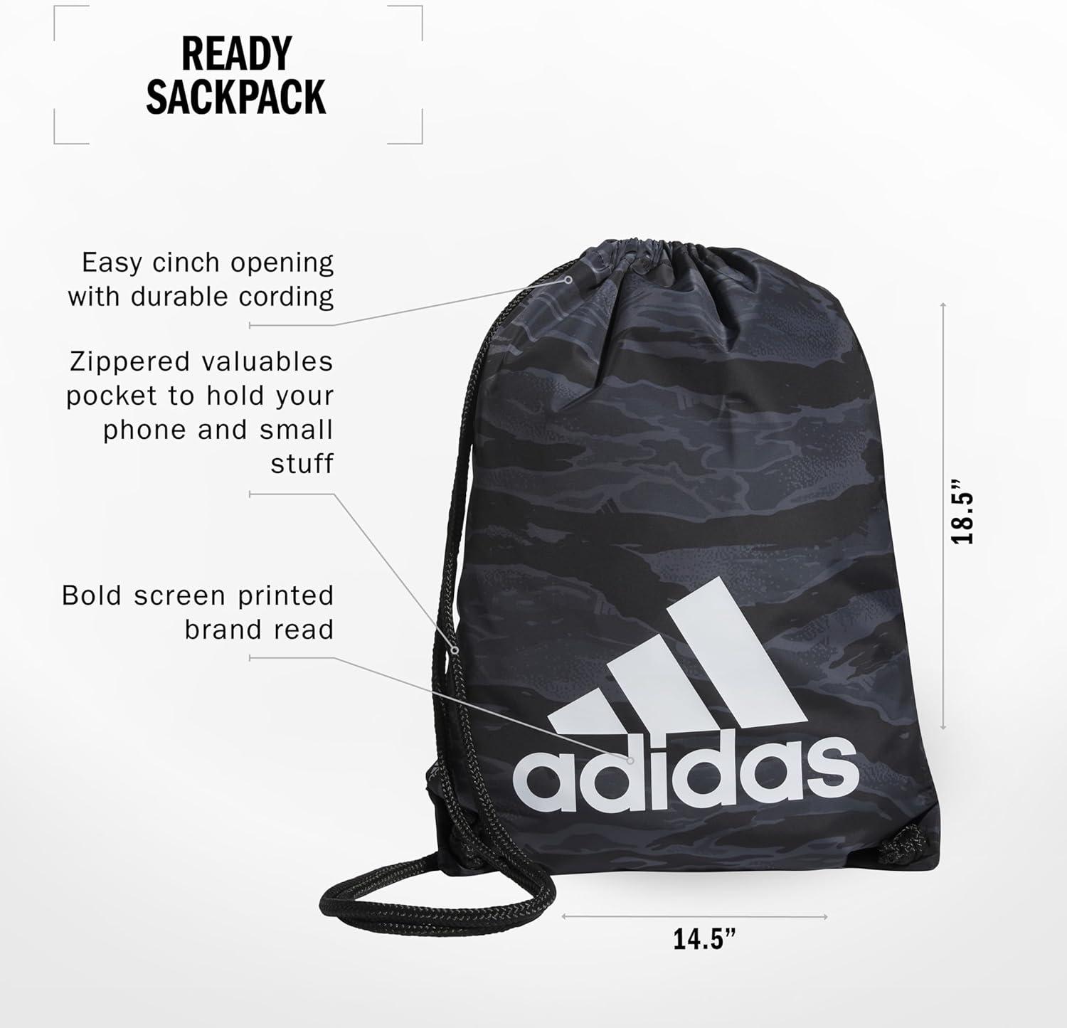 adidas Ready Sackpack – Drawstring Backpack Lightweight Small Gym Bag, Black/Gold Metallic/1.0, One Size(Essential Camo Black/White/1.0)