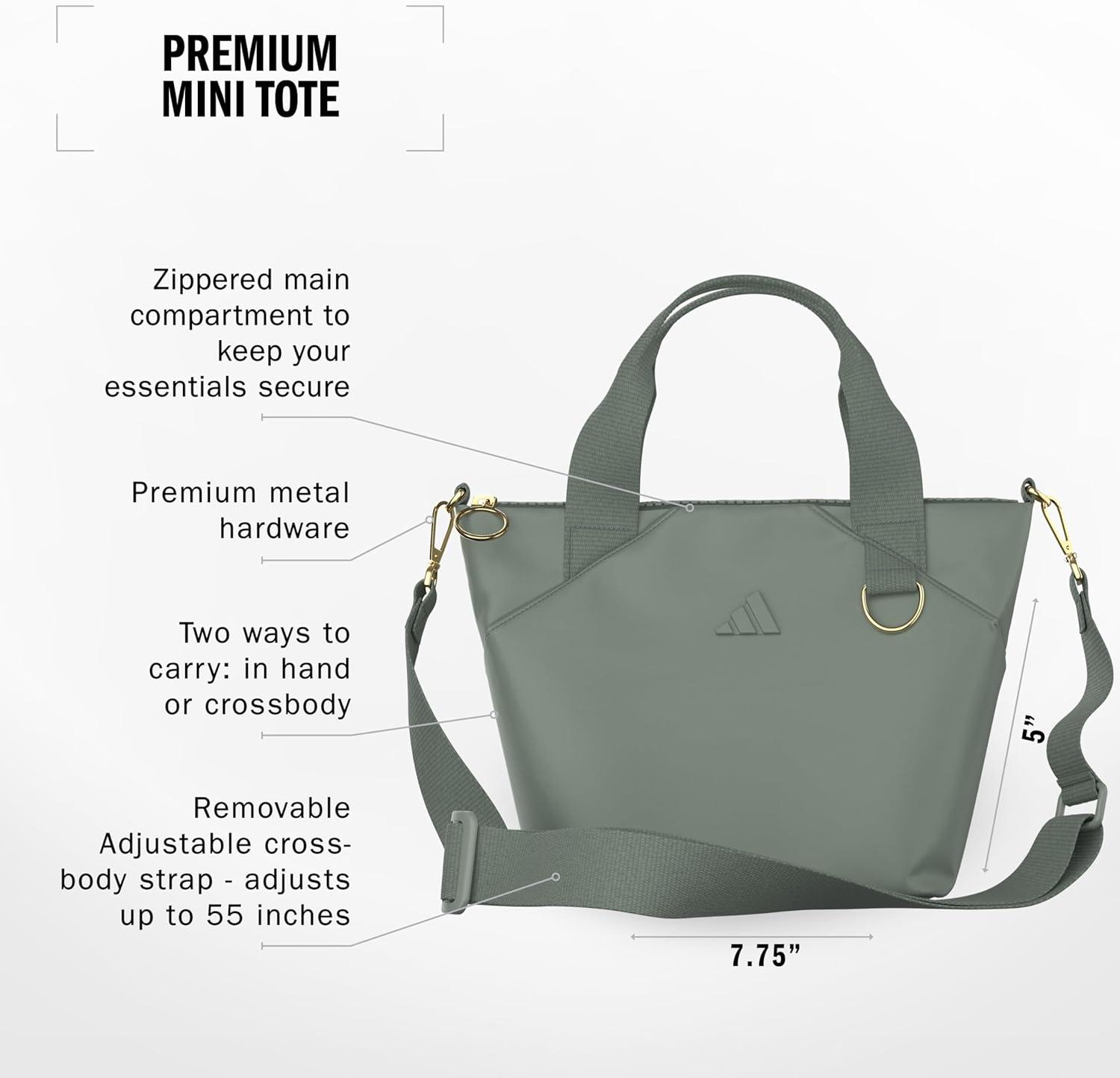 All the tote you need and more to carry on throughout your day. With handles and a removable crossbody strap that adjusts to up 55 inches, this adidas mini tote gives you two ways to go. It's made from durable polyester with premium metallic hardware, including an external D-ring. The main compartment zips up to keep your goods secure.