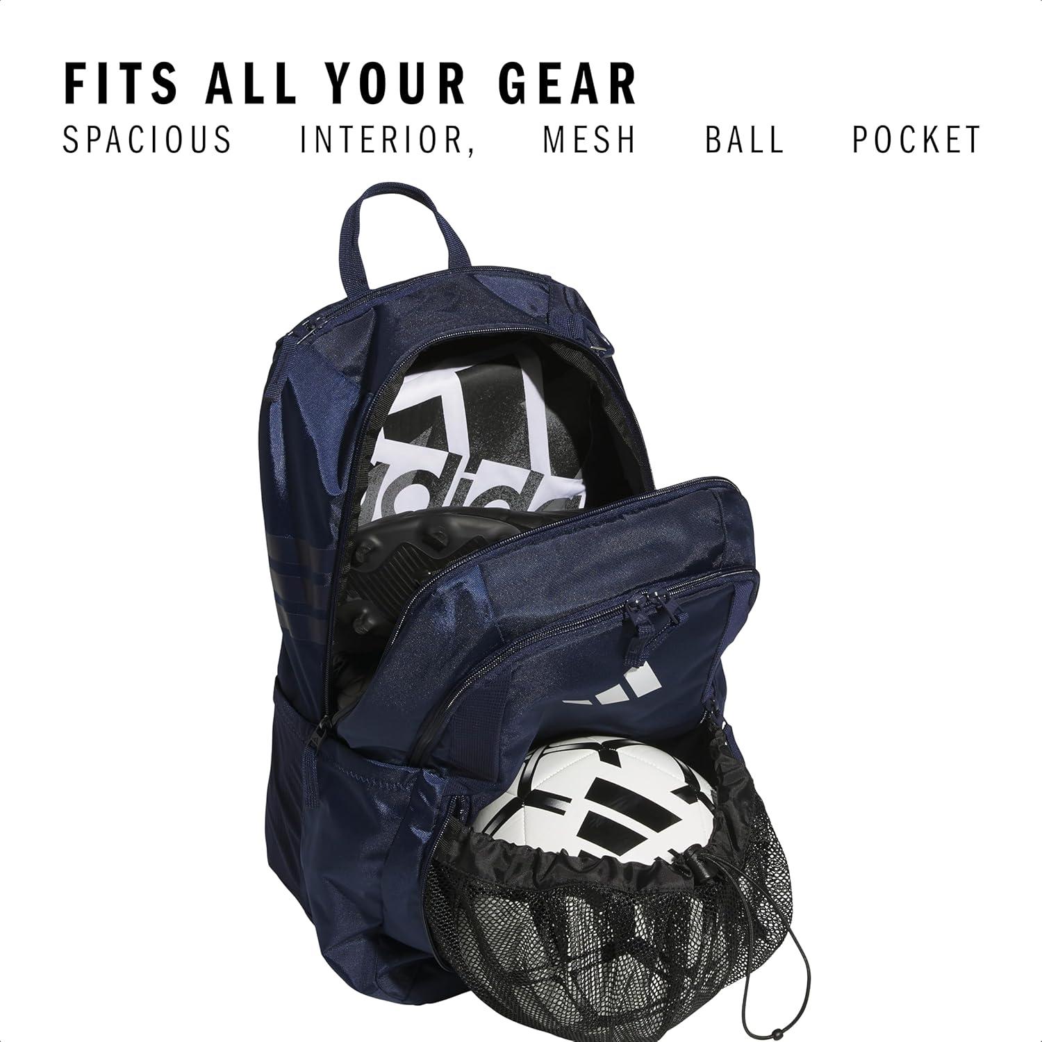 This adidas bundle includes a 36L backpack made of durable polyester material and a 28oz BPA-free plastic water bottle. The backpack has a water-resistant base to keep your belongings dry. It features multiple zippered pockets, including a vented one for dirty gear and two side mesh pockets for 32oz water bottles. A unique bottom zippered pocket can fit a size 5 soccer ball. With lifetime warranty, this backpack ensures reliable performance during athletic activities or daily use. Complementing the backpack is an odor and stain resistant 28oz water bottle with measurement markings. Its ergonomic shape and locking spout make hydration easy during intense training. The bold blue and metallic silver colors of both products mean you can stay coordinated from the field to the locker room. With storage for a ball and two water bottles, this bundle lets you gear up for practice or games. The backpack's durability and water resistance paired with the water bottle's BPA-free reusable design offer convenience and sustainability for an active lifestyle.