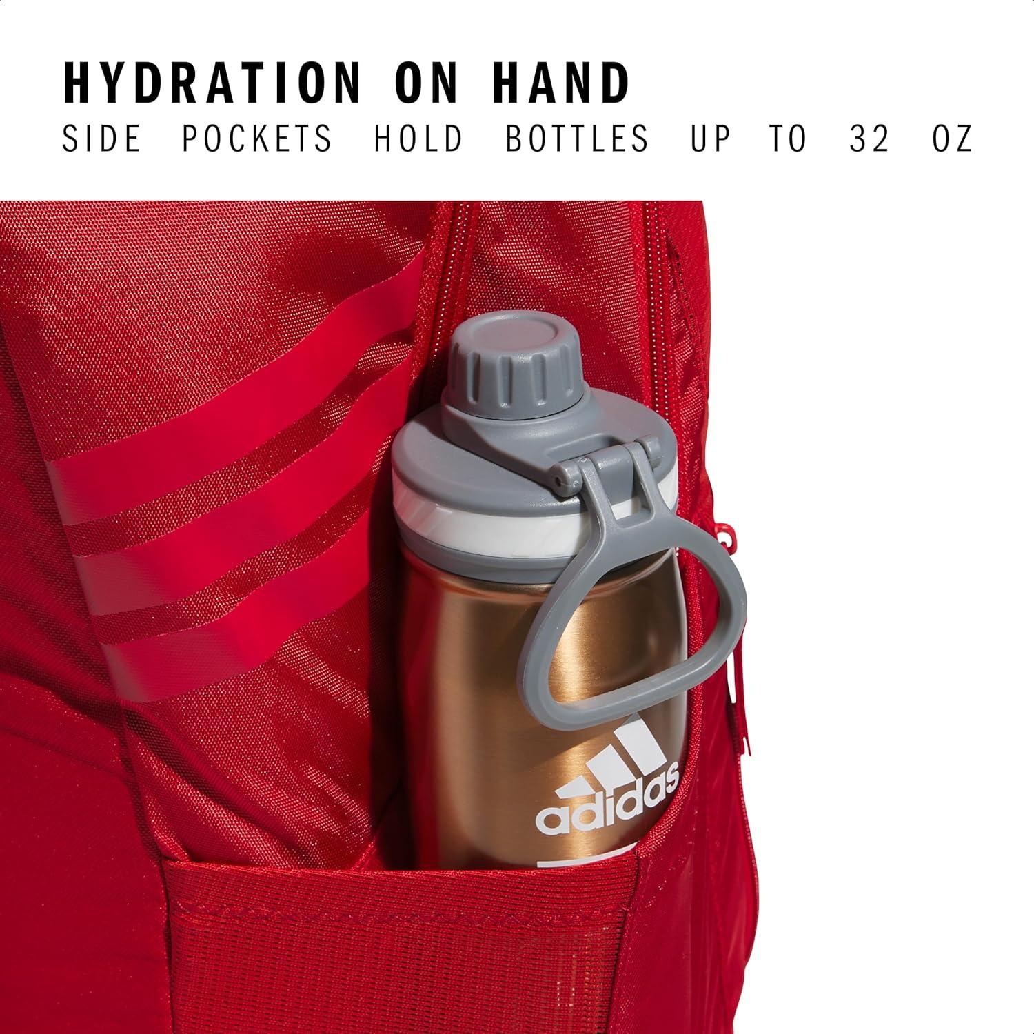 This adidas bundle includes a 36L backpack made of durable polyester material and a 28oz BPA-free plastic water bottle. The backpack has a water-resistant base to keep your belongings dry. It features multiple zippered pockets, including a vented one for dirty gear and two side mesh pockets for 32oz water bottles. A unique bottom zippered pocket can fit a size 5 soccer ball. With lifetime warranty, this backpack ensures reliable performance during athletic activities or daily use. Complementing the backpack is an odor and stain resistant 28oz water bottle with measurement markings. Its ergonomic shape and locking spout make hydration easy during intense training. The bold blue and metallic silver colors of both products mean you can stay coordinated from the field to the locker room. With storage for a ball and two water bottles, this bundle lets you gear up for practice or games. The backpack's durability and water resistance paired with the water bottle's BPA-free reusable design offer convenience and sustainability for an active lifestyle.