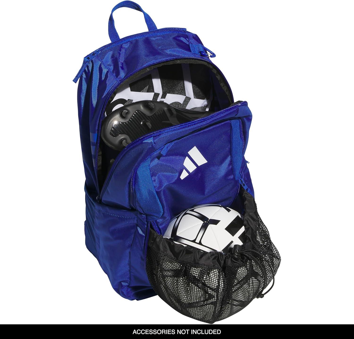 This adidas bundle includes a 36L backpack made of durable polyester material and a 28oz BPA-free plastic water bottle. The backpack has a water-resistant base to keep your belongings dry. It features multiple zippered pockets, including a vented one for dirty gear and two side mesh pockets for 32oz water bottles. A unique bottom zippered pocket can fit a size 5 soccer ball. With lifetime warranty, this backpack ensures reliable performance during athletic activities or daily use. Complementing the backpack is an odor and stain resistant 28oz water bottle with measurement markings. Its ergonomic shape and locking spout make hydration easy during intense training. The bold blue and metallic silver colors of both products mean you can stay coordinated from the field to the locker room. With storage for a ball and two water bottles, this bundle lets you gear up for practice or games. The backpack's durability and water resistance paired with the water bottle's BPA-free reusable design offer convenience and sustainability for an active lifestyle.