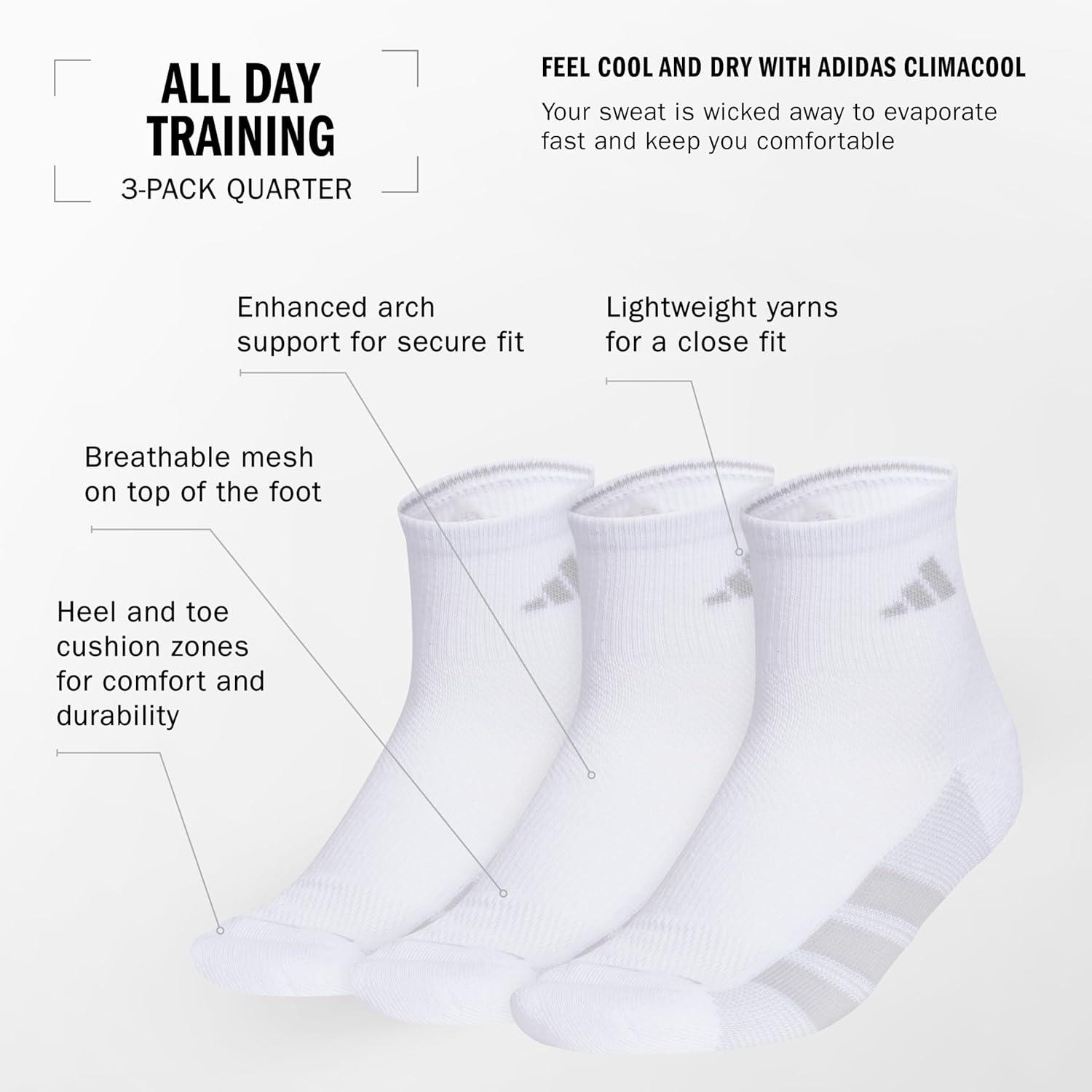 adidas Women’s All Day Training Quarter Socks (3-pair) Athletic Performance Above the Ankle Height, Targeted Cushion for Running