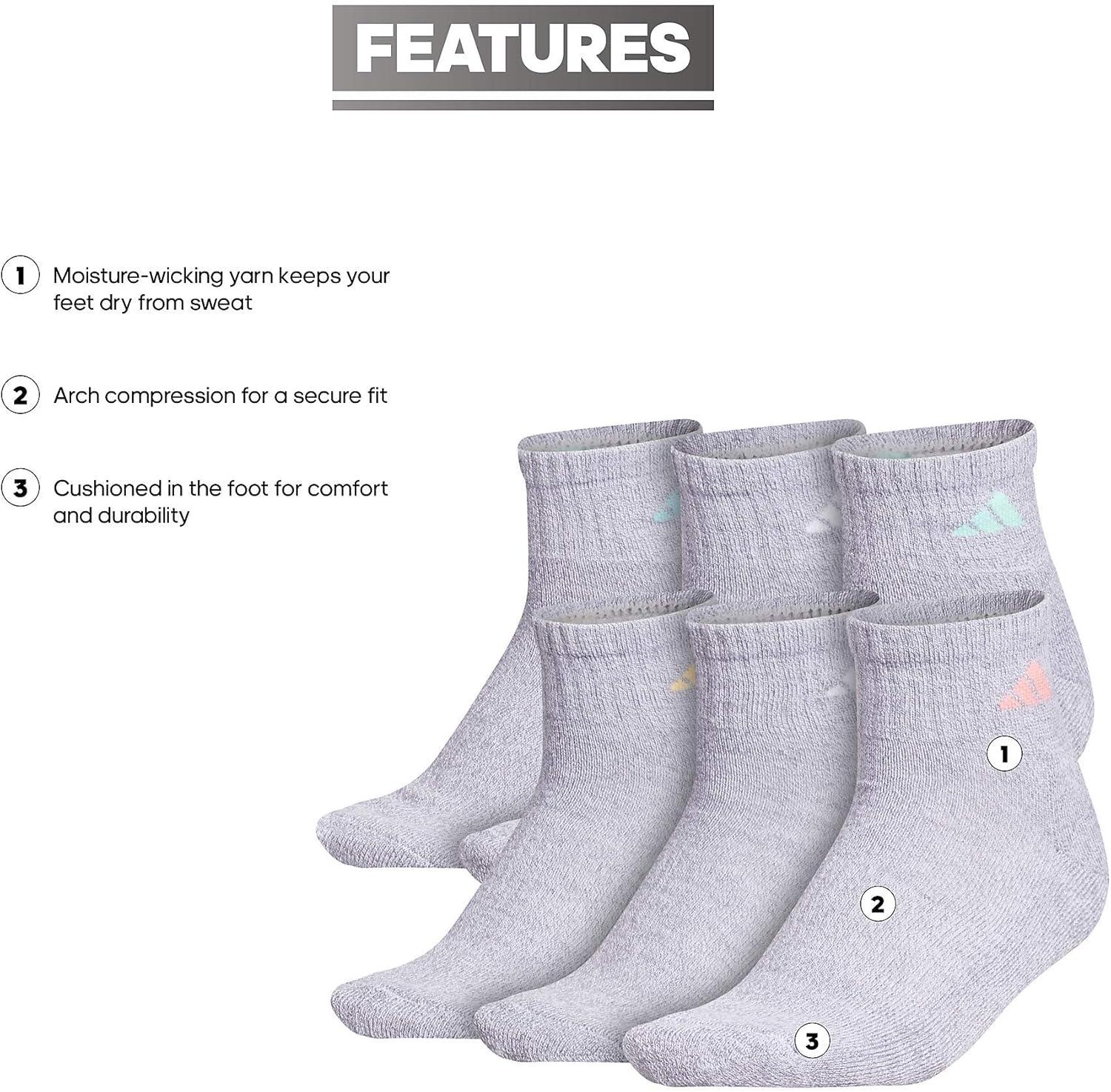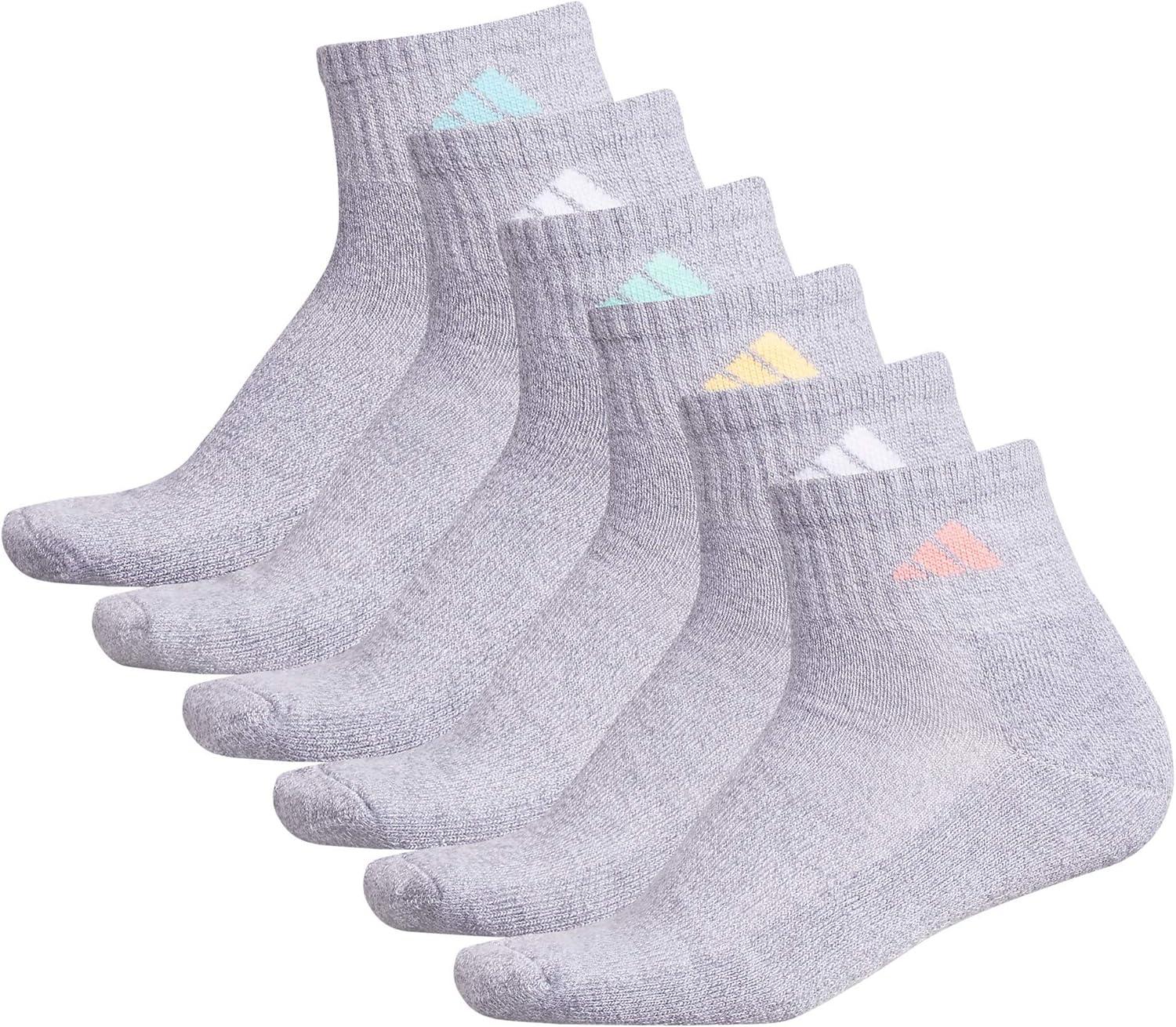 adidas Women’s Ankle Socks, Athletic Cushioned Quarter Fit, 6-Pack, Durable, Comfortable, Cooling, with Compression(Grey/Bliss Pop/Clear Mint)