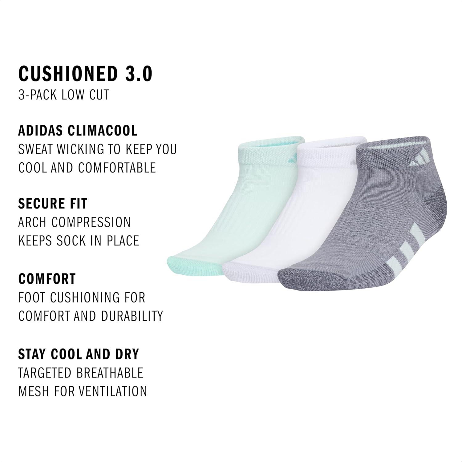 adidas Women’s Cushioned Low Cut Socks with Arch Compression (3 Pairs)(Halo Mint Green/White/Grey)