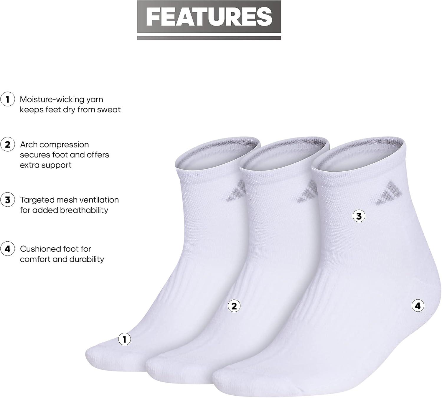 These adidas quarter-length socks keep feet dry and comfortable during any training session. They're made with moisture-wicking yarn and have mesh zones for added ventilation. A cushioned footbed has a soft feel from step-in to step-out.