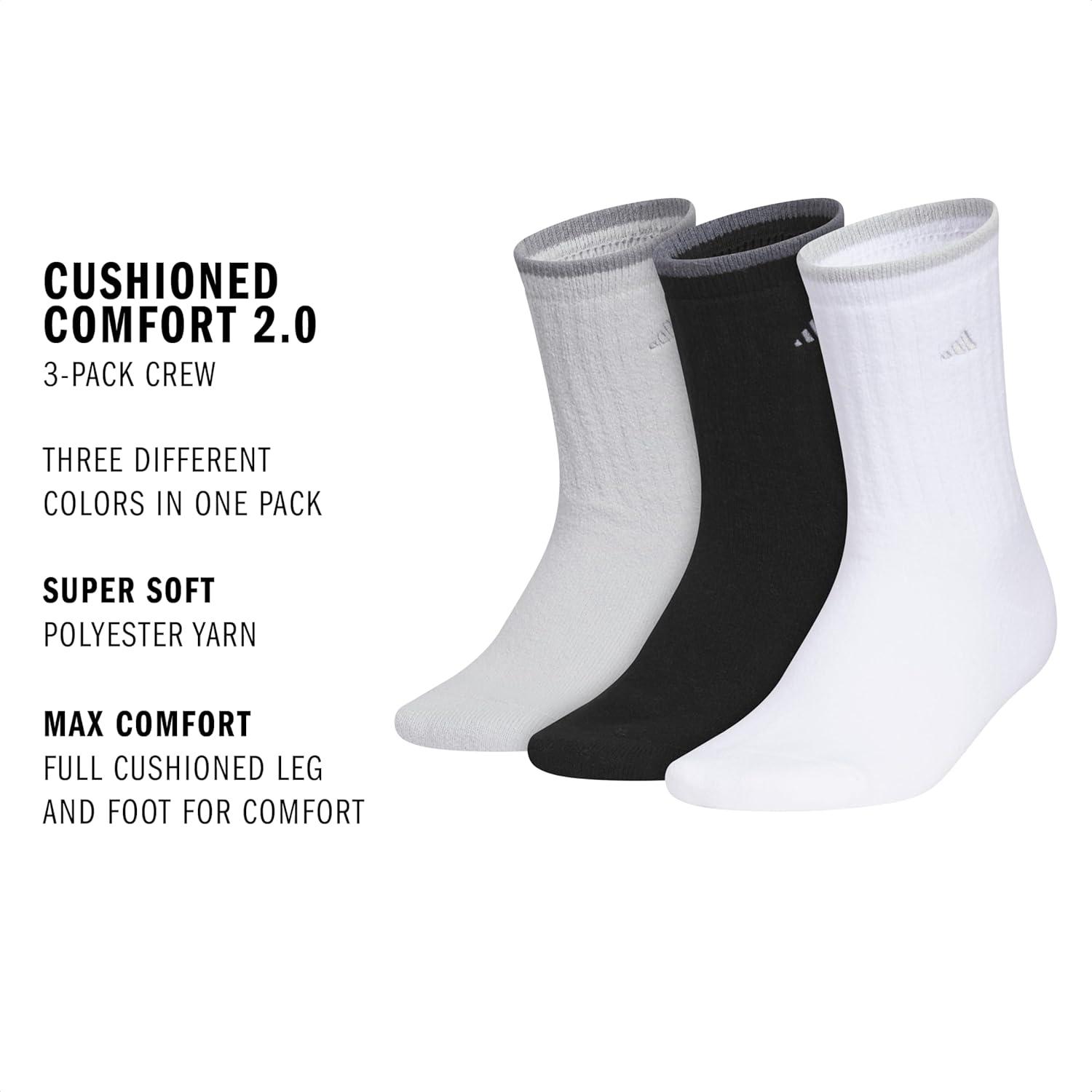 Show your feet some love in these adidas crew-length socks. The three-pack includes super soft yarns with three different colored socks, all with embroidered branding. A full cushioned leg and footbed provide all-day comfort.