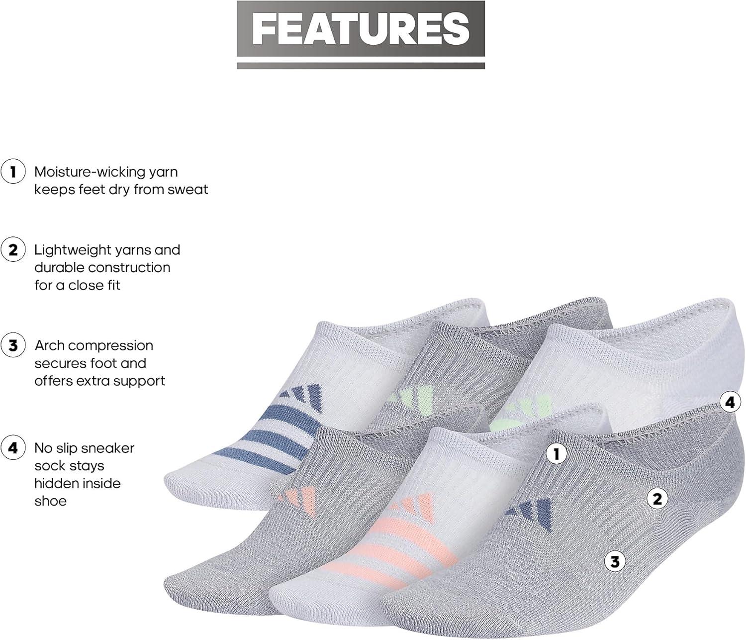 adidas Women’s Superlite 3.0 6-Pack Super No Show, Athletic Socks, Invisible Ultra Low-Profile, Cushion & Arch Compression(Clear Onix Grey/Semi Green Spark/Preloved Ink Blue)
