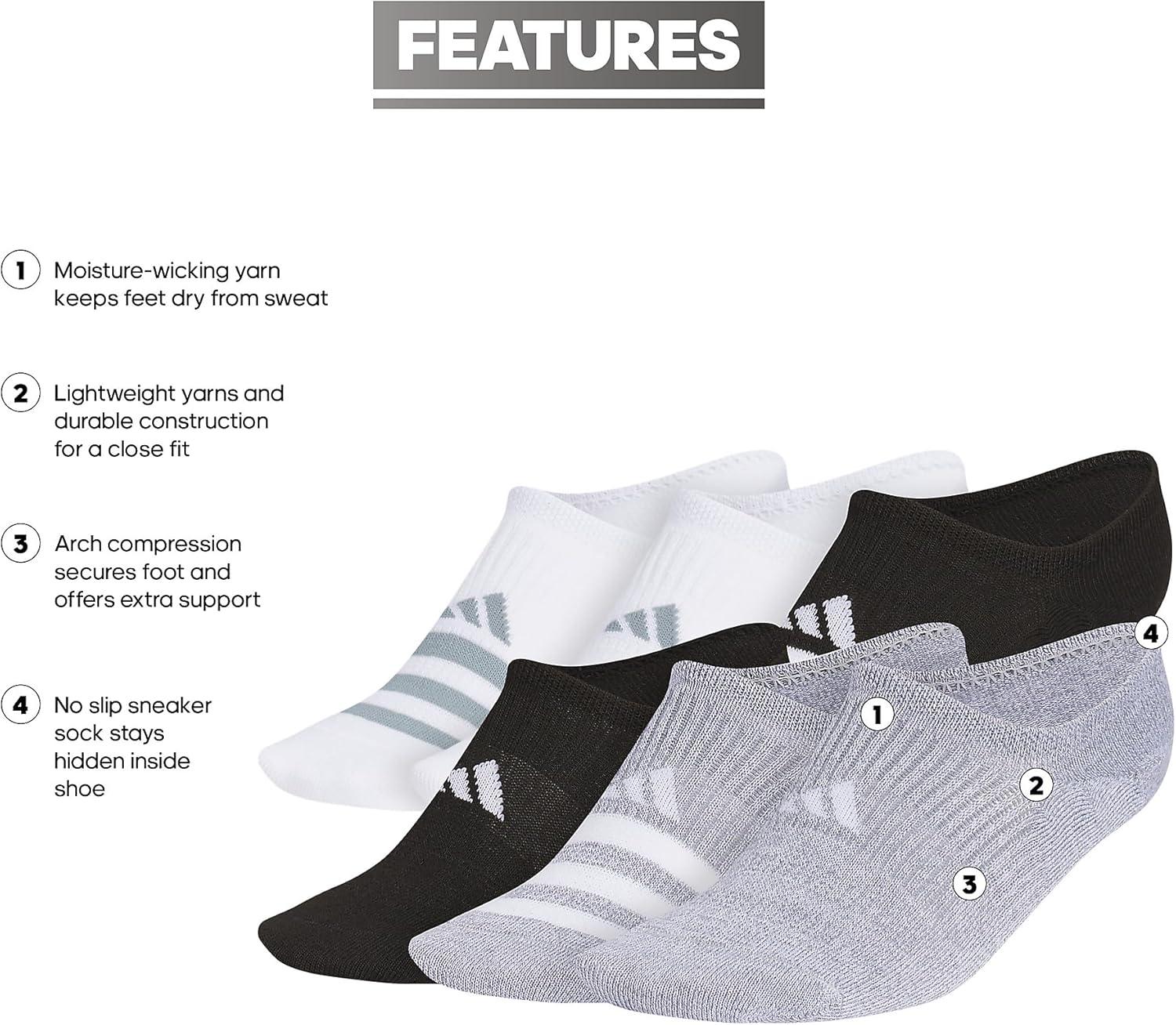 adidas Women’s Superlite 3.0 6-Pack Super No Show, Athletic Socks, Invisible Ultra Low-Profile, Cushion & Arch Compression(White/Black/Grey)
