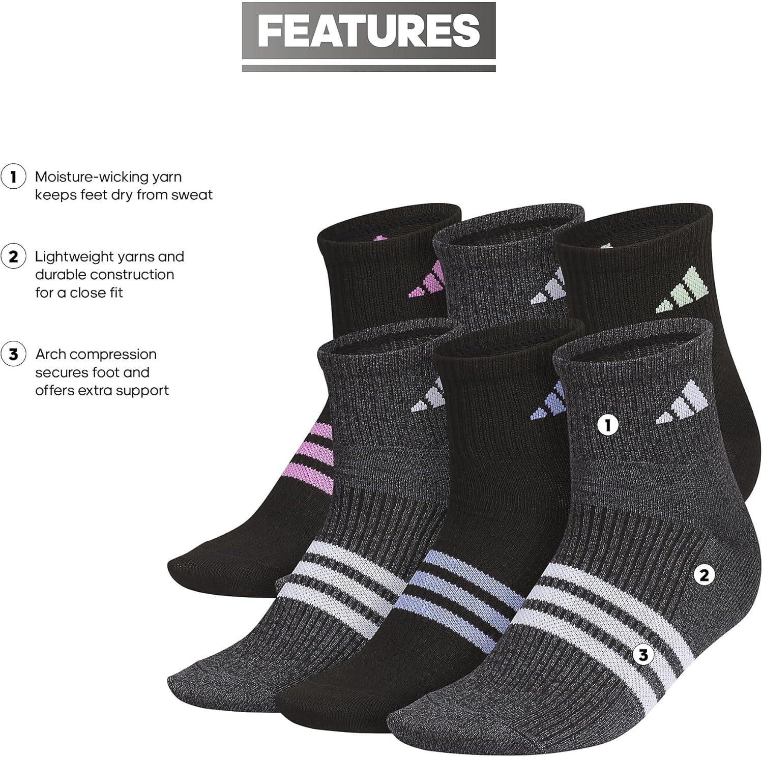 Your feet are your foundation. Treat them right with these super-light women's adidas socks. Lightweight and long-lasting, they hug your feet with a secure fit and supportive arch compression, making them suitable for various activities and great as tennis socks women and golf socks for women. Don't worry about breaking a sweat. These women's athletic socks feature moisture-wicking yarn and can be used as womens work socks. Whether you're looking for womens quarter socks or sport socks for women, these socks provide arch support compression and moisture wicking for your feet.