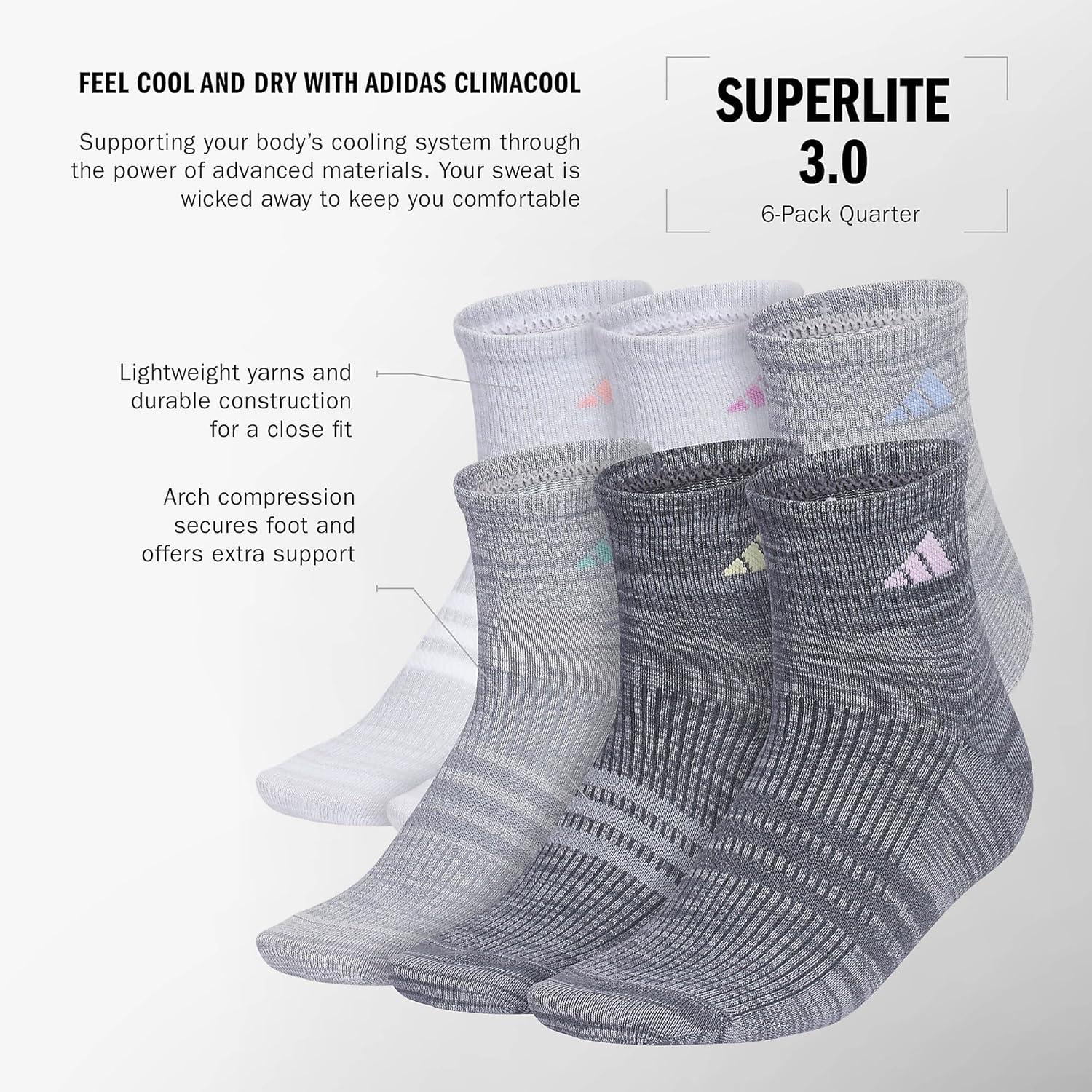adidas womens Superlite Quarter Ankle Socks (6-pair Pack)(Clear Onix Grey/Semi Pink Spark/Preloved Purple)